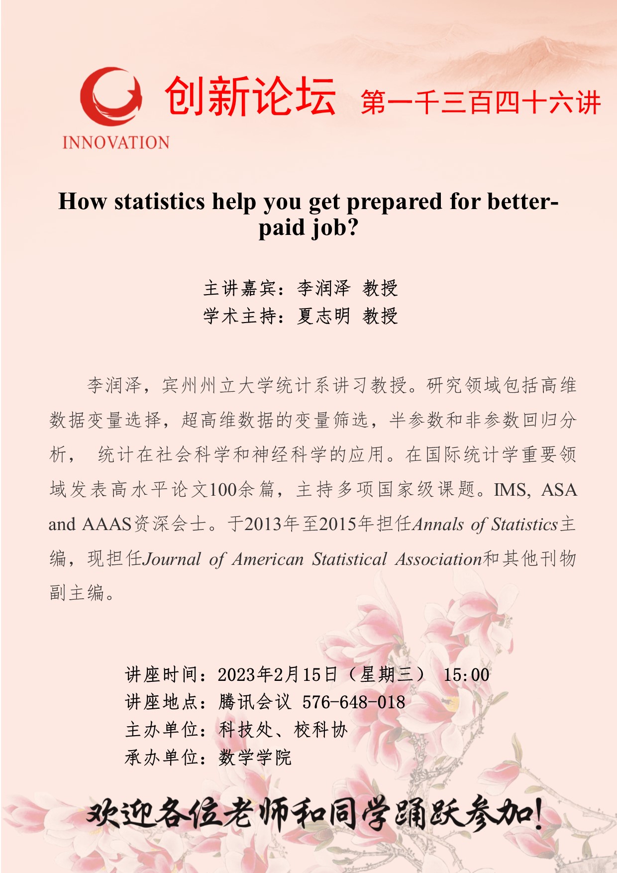 李润泽 教授 赢博官方(中国)总部创新论坛第一千三百四十六讲:How statistics help you get prepared for better-paid job? 讲座时间 2023年2月15日(星期三) 15:00 讲座地点 腾讯会议 576-648-018 讲座人介绍 李润泽 教授 讲座内容