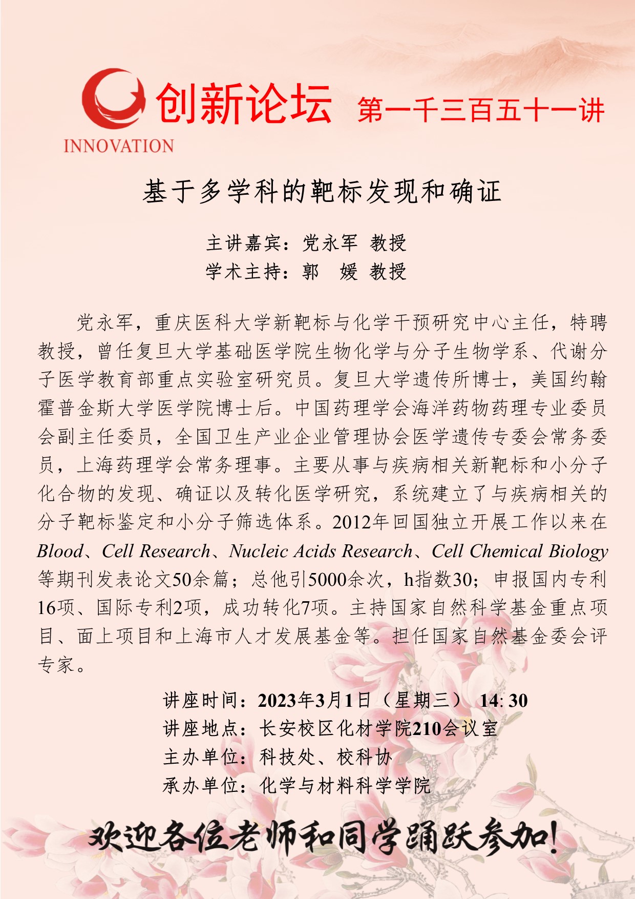 党永军 教授 赢博官方(中国)总部创新论坛第一千三百五十一讲:基于多学科的靶标发现和确证 讲座时间 2023年3月1日(星期三) 14: 30 讲座地点 长安校区化材学院210会议室 讲座人介绍 党永军 教授 讲座内容