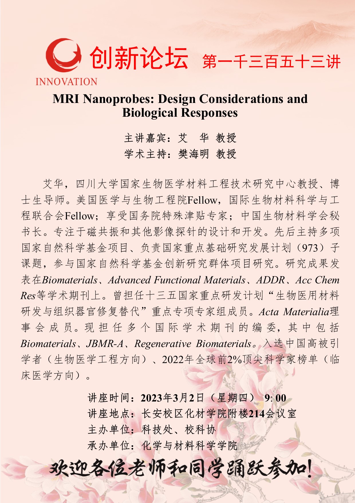 艾华 教授 赢博官方(中国)总部创新论坛第一千三百五十三讲:MRI Nanoprobes: Design Considerations and Biological Responses 讲座时间 2023年3月2日(星期四) 9: 00 讲座地点 长安校区化材学院附楼214会议室 讲座人介绍 艾华 教授 讲座内容