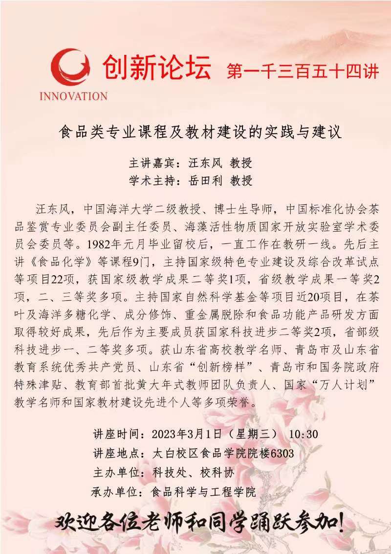 汪东风 教授 赢博官方(中国)总部创新论坛第一千三百五十四讲:食品类专业课程及教材建设的实践与建议 讲座时间 2023年3月1日(星期三) 10:30 讲座地点 太白校区食品学院院楼6303 讲座人介绍 汪东风 教授 讲座内容