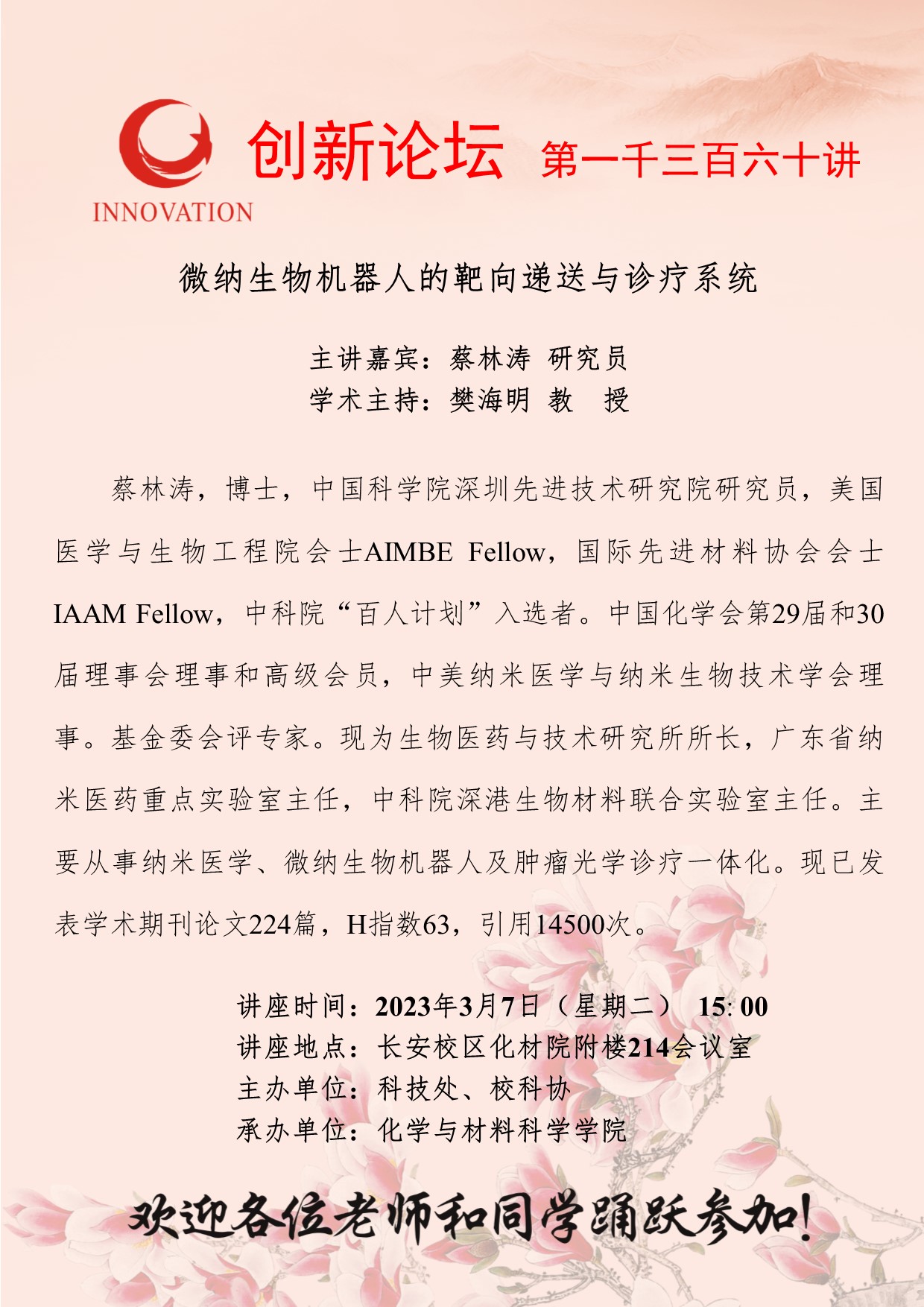 蔡林涛 研究员 赢博官方(中国)总部创新论坛第一千三百六十讲:微纳生物机器人的靶向递送与诊疗系统 讲座时间 2023年3月7日(星期二) 15: 00 讲座地点 长安校区化材院附楼214会议室 讲座人介绍 蔡林涛 研究员 讲座内容