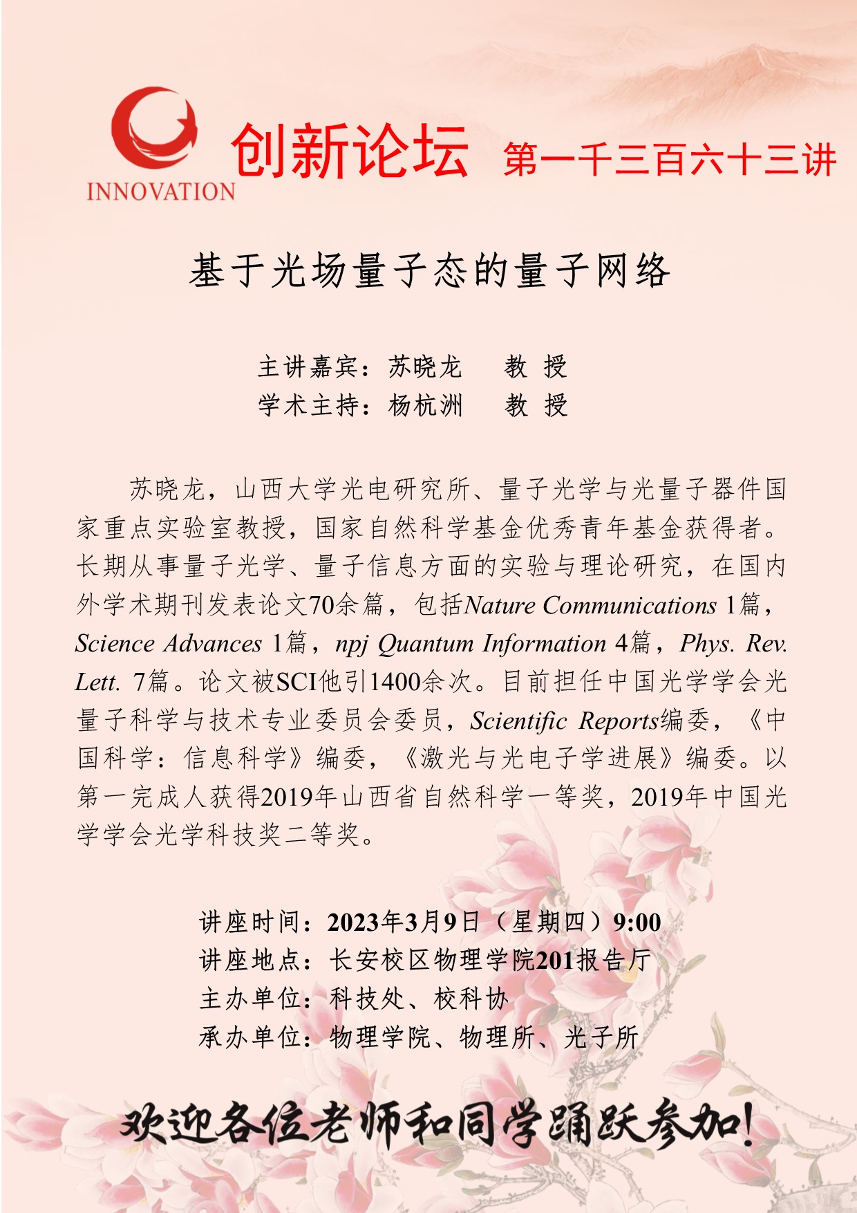 苏晓龙 教授 赢博官方(中国)总部创新论坛第一千三百六十三讲:基于光场量子态的量子网络 讲座时间 2023年3月9日(星期四)9:00 讲座地点 长安校区物理学院201报告厅 讲座人介绍 苏晓龙 教授 讲座内容