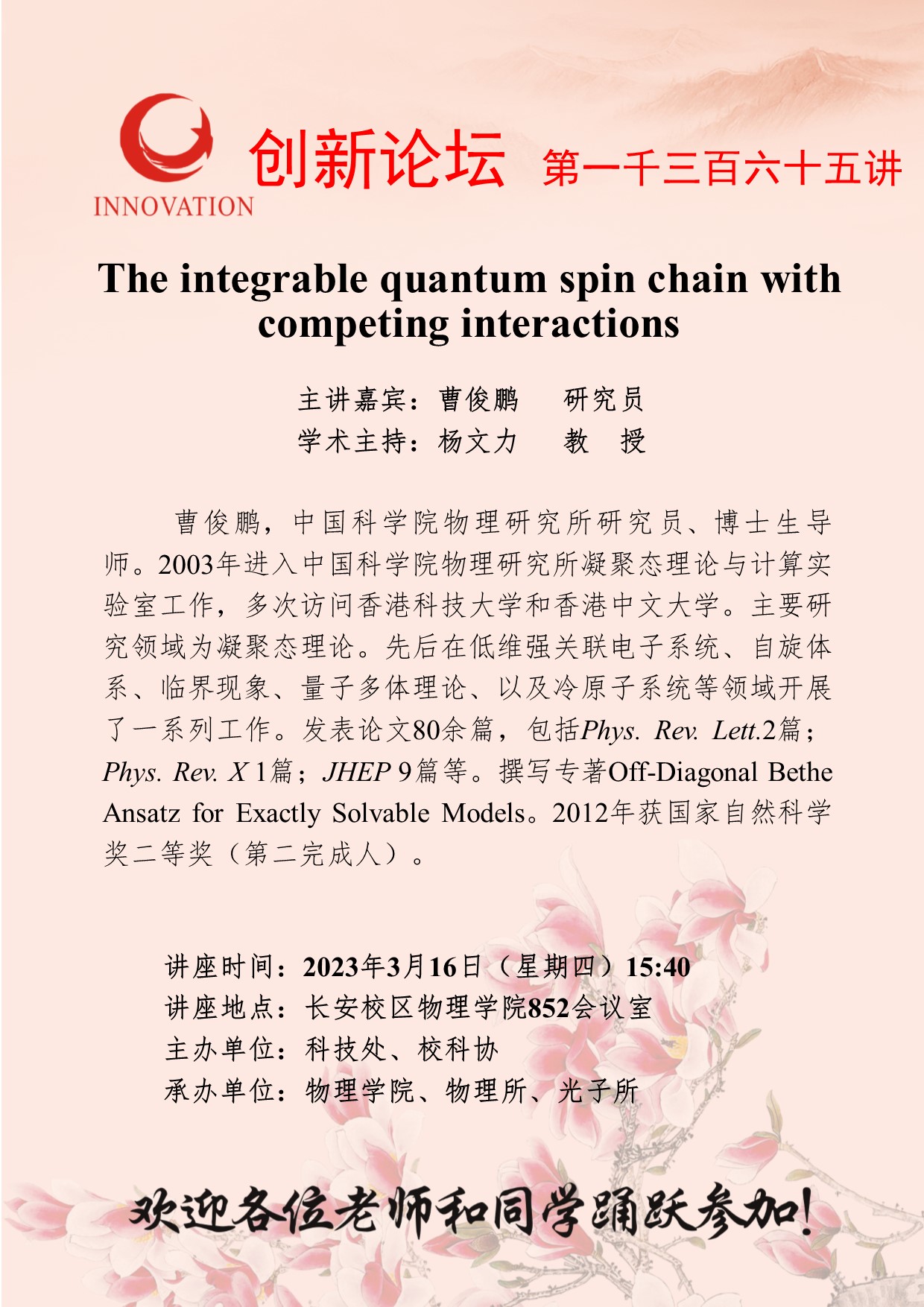 曹俊鹏 研究员 赢博官方(中国)总部创新论坛第一千三百六十五讲:The integrable quantum spin chain with competing interactions 讲座时间 2023年3月16日(星期四)15:40 讲座地点 长安校区物理学院852会议室 讲座人介绍 曹俊鹏 研究员 讲座内容