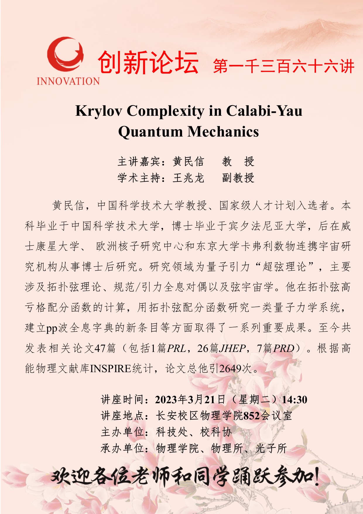 黄民信 教授 赢博官方(中国)总部创新论坛第一千三百六十六讲:Krylov Complexity in Calabi-Yau Quantum Mechanics 讲座时间 2023年3月21日(星期二)14:30 讲座地点 长安校区物理学院852会议室 讲座人介绍 黄民信 教授 讲座内容