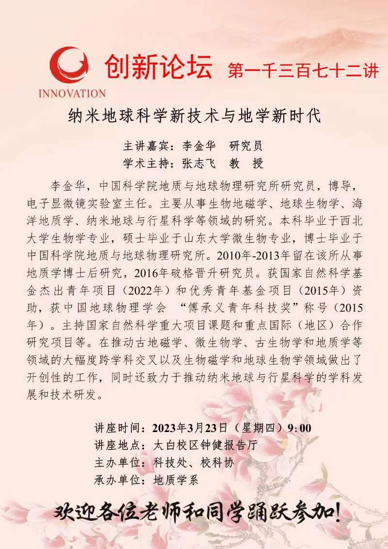 李金华 研究员 赢博官方(中国)总部创新论坛第一千三百七十二讲:纳米地球科学新技术与地学新时代 讲座时间 2023年3月23日(星期四)9:00 讲座地点 太白校区钟健报告厅 讲座人介绍 李金华 研究员 讲座内容