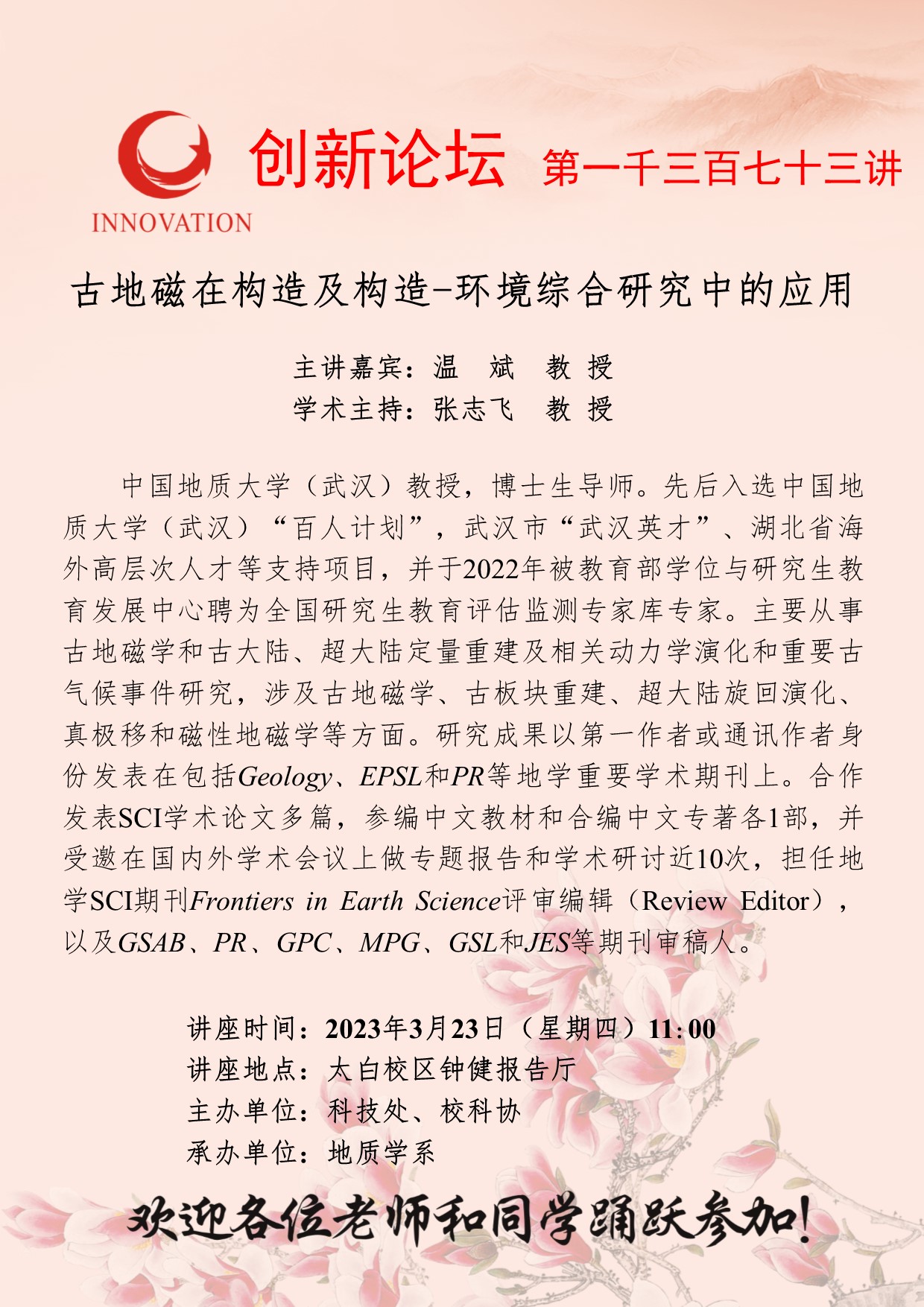 温斌 教授 赢博官方(中国)总部创新论坛第一千三百七十三讲:古地磁在构造及构造-环境综合研究中的应用 讲座时间 2023年3月23日(星期四)11:00 讲座地点 太白校区钟健报告厅 讲座人介绍 温斌 教授 讲座内容
