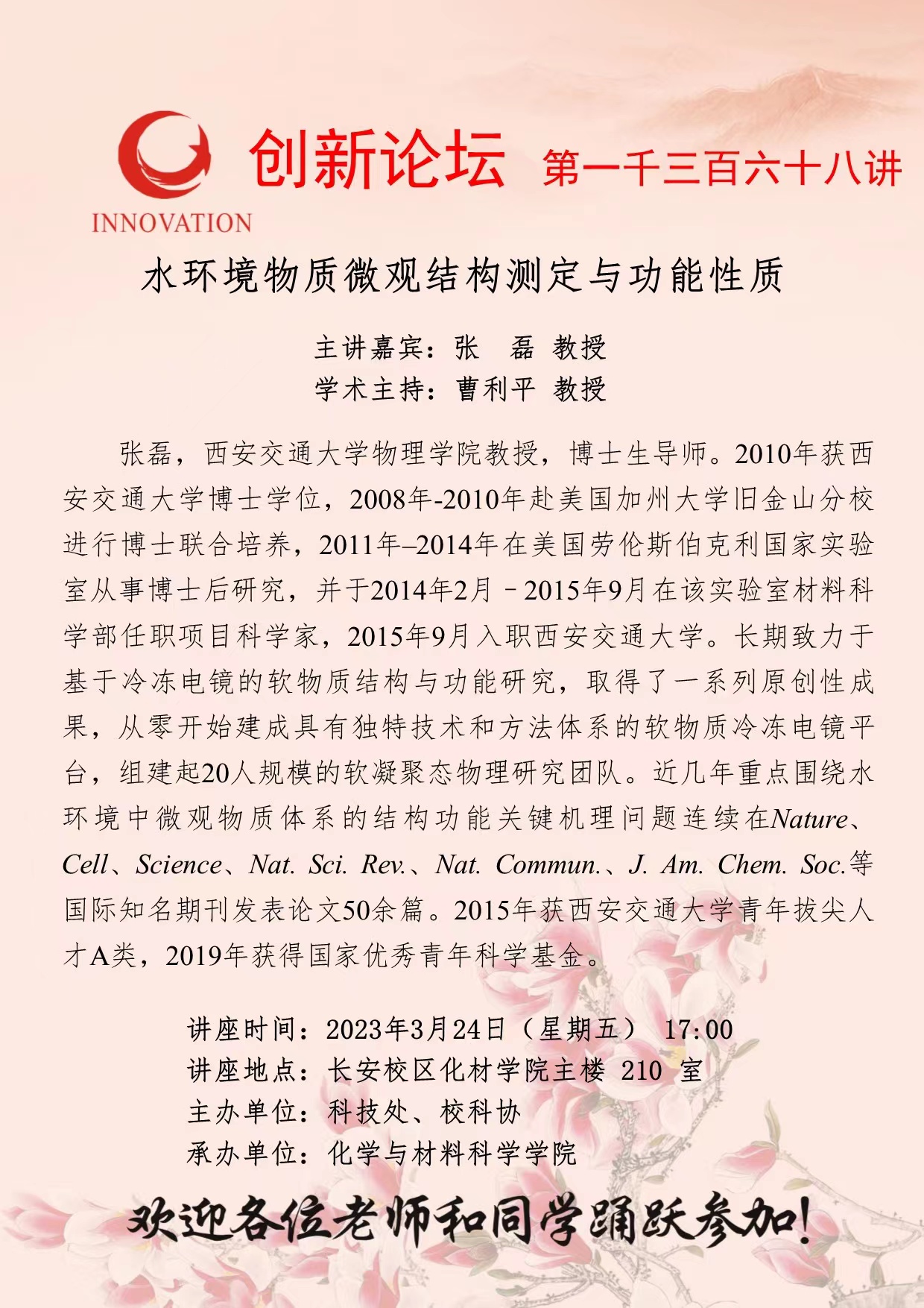 张磊 教授 赢博官方(中国)总部创新论坛第一千三百六十八讲:水环境物质微观结构测定与功能性质机理 讲座时间 2023年3月24日(星期五) 17:00 讲座地点 长安校区化材学院主楼 210 室 讲座人介绍 张磊 教授 讲座内容