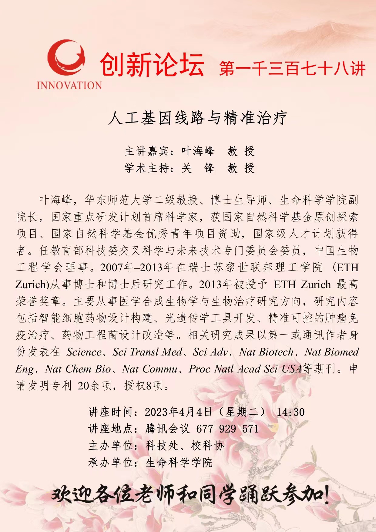 叶海峰 教授 赢博官方(中国)总部创新论坛第一千三百七十八讲:人工基因线路与精准治疗 讲座时间 2023年4月4日(星期二) 14:30 讲座地点 腾讯会议 677 929 571 讲座人介绍 叶海峰 教授 讲座内容