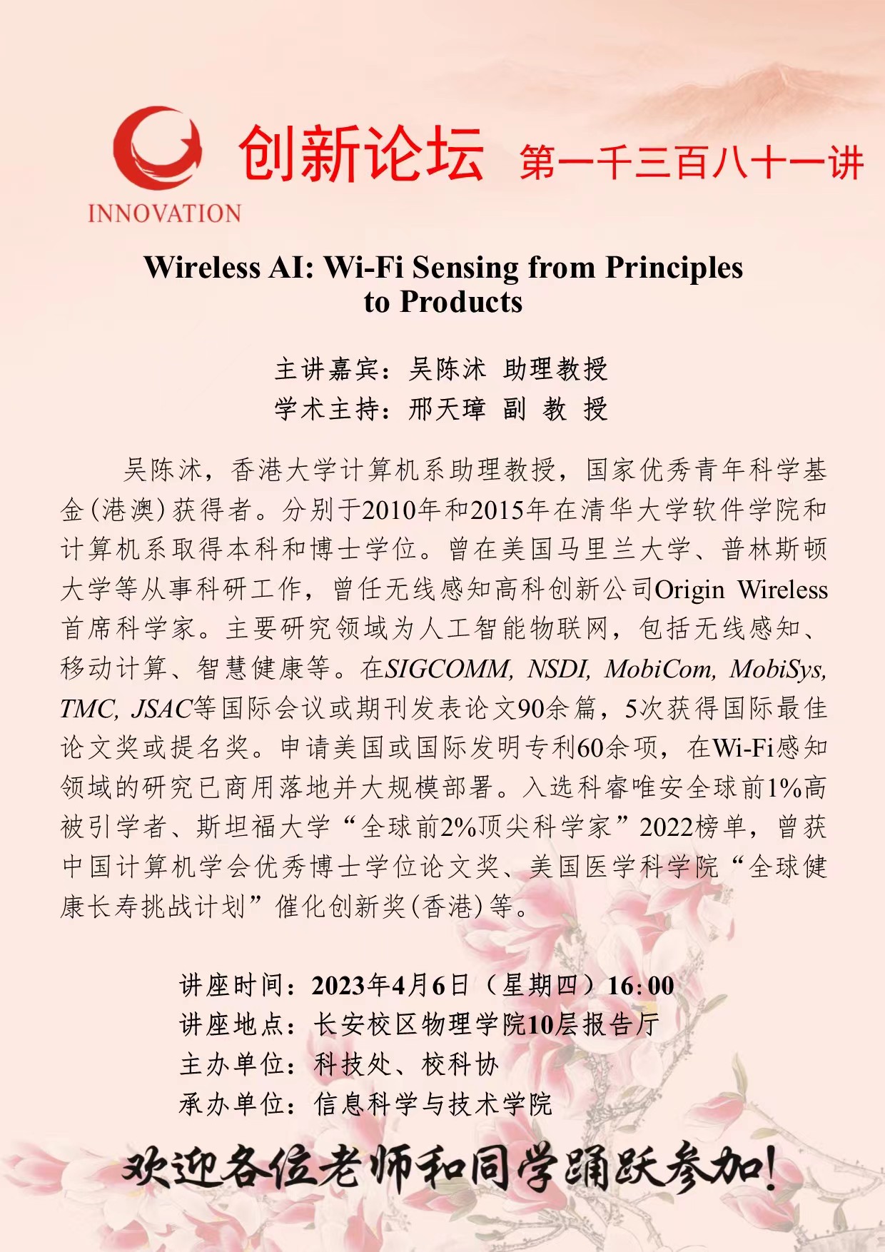 吴陈沭 助理教授 赢博官方(中国)总部创新论坛第一千三百八十一讲:Wireless AI: Wi-Fi Sensing from Principles to Products 讲座时间 2023年4月6日(星期四)16:00 讲座地点 长安校区物理学院10层报告厅 讲座人介绍 吴陈沭 助理教授 讲座内容
