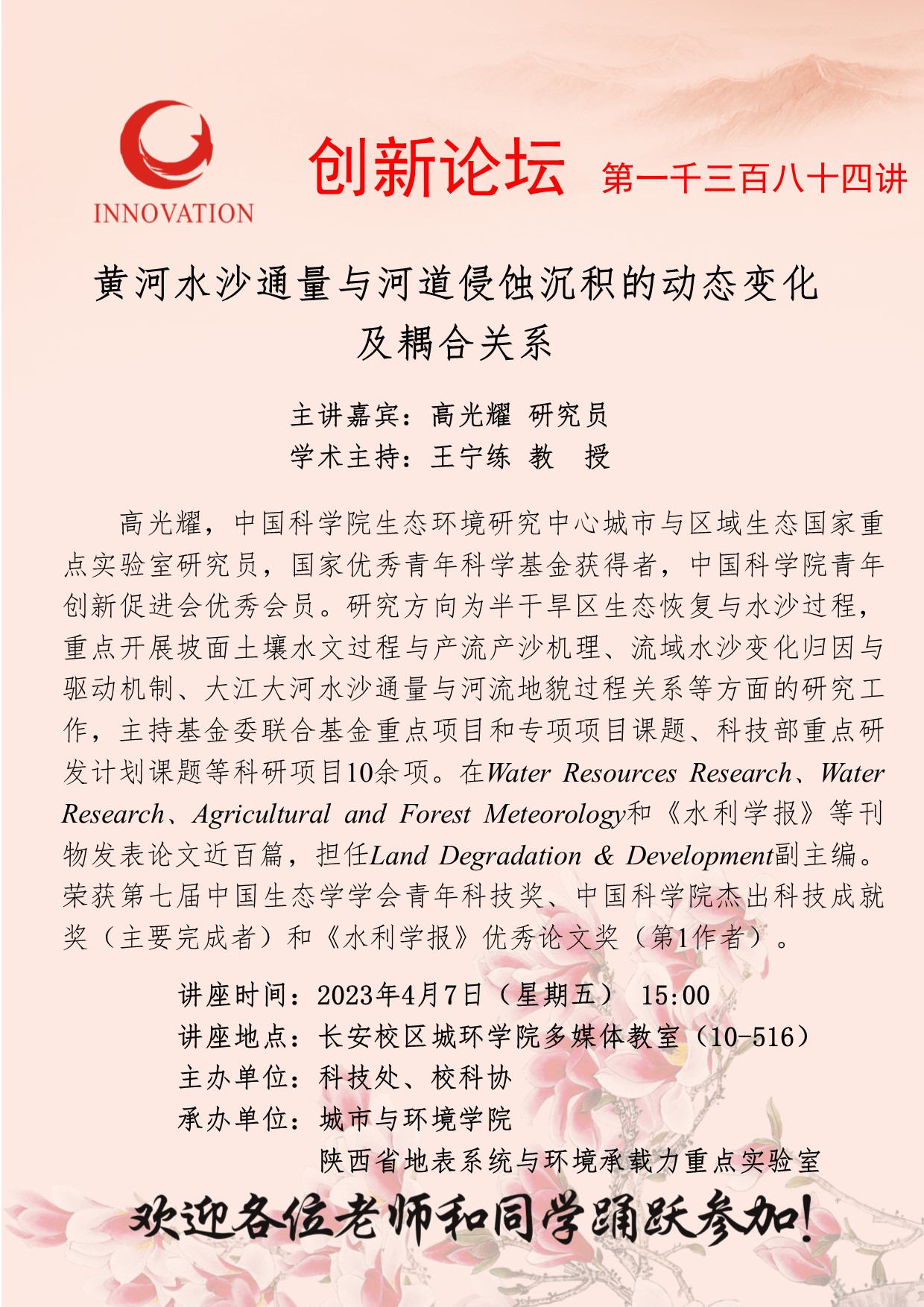 高光耀 研究员 赢博官方(中国)总部创新论坛第一千三百八十四讲:黄河水沙通量与河道侵蚀沉积的动态变化及耦合关系 讲座时间 2023年4月7日(星期五) 15:00 讲座地点 长安校区城环学院多媒体教室(10-516) 讲座人介绍 高光耀 研究员 讲座内容