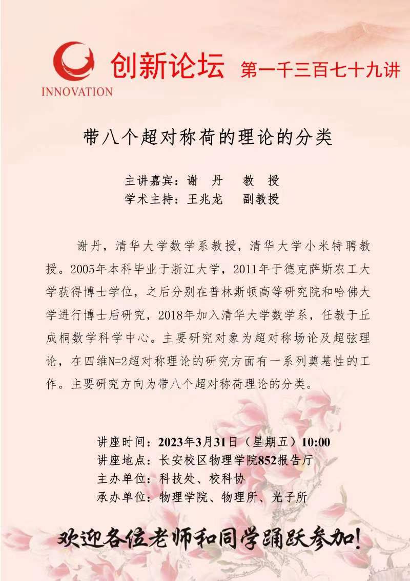 谢丹 教授 赢博官方(中国)总部创新论坛第一千三百七十九讲:带八个超对称荷的理论的分类 讲座时间 2023年3月31日(星期五)10:00 讲座地点 长安校区物理学院852报告厅 讲座人介绍 谢丹 教授 讲座内容