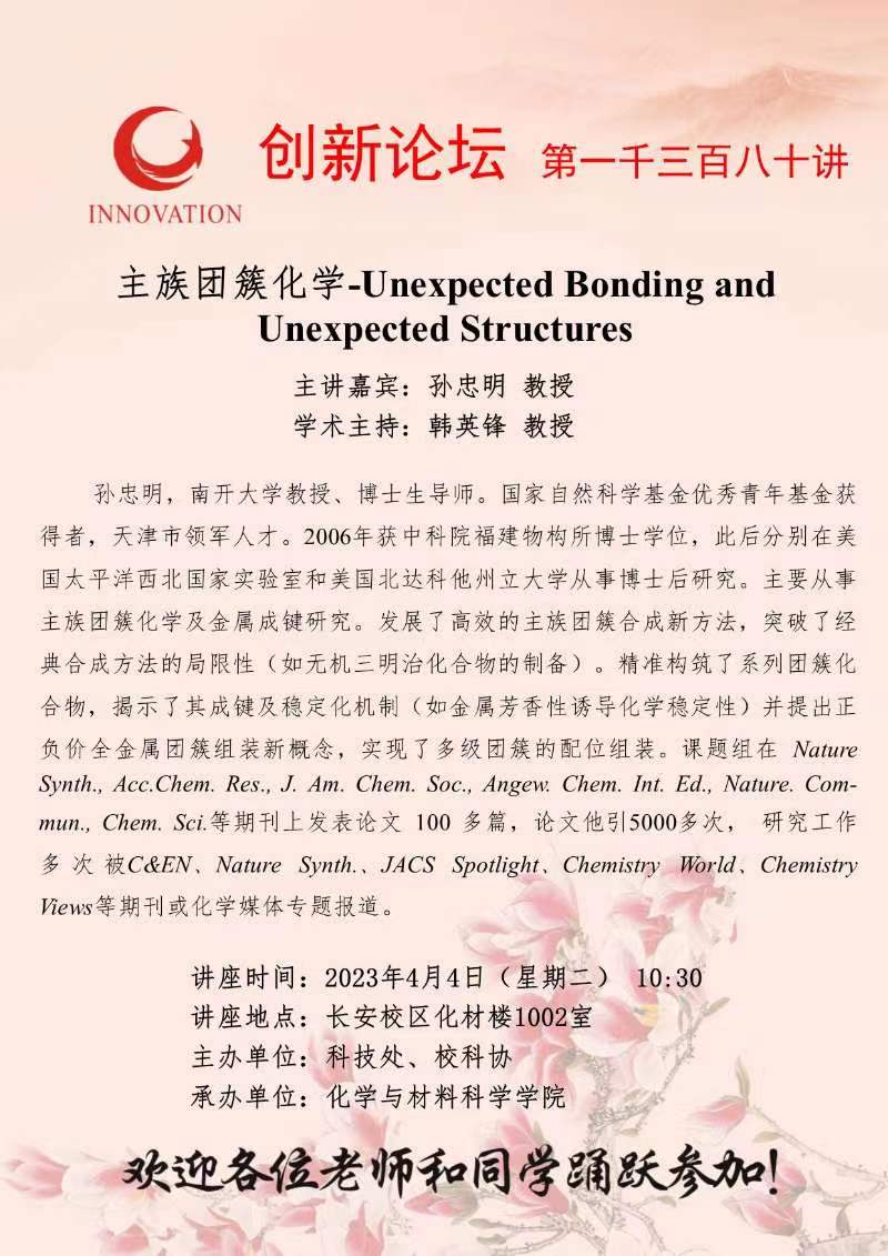 孙忠明 教授 赢博官方(中国)总部创新论坛第一千三百八十讲:主族团簇化学-Unexpected Bonding and Unexpected Structures 讲座时间 2023年4月4日(星期二) 10:30 讲座地点 长安校区化材楼1002室 讲座人介绍 孙忠明 教授 讲座内容
