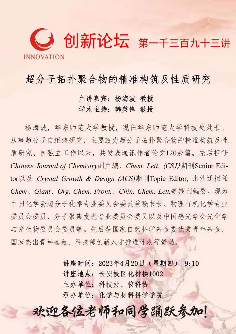 杨海波 教授 赢博官方(中国)总部创新论坛第一千三百九十三讲:超分子拓扑聚合物的精准构筑及性质研究 讲座时间 2023年4月20日(星期四) 9:10 讲座地点 长安校区化材楼1002 讲座人介绍 杨海波 教授 讲座内容