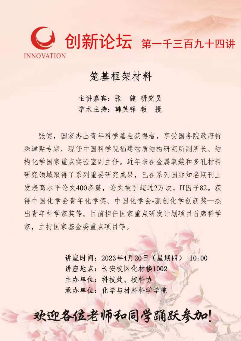 张 健 研究员 赢博官方(中国)总部创新论坛第一千三百九十四讲:笼基框架材料 讲座时间 2023年4月20日(星期四) 10:00 讲座地点 长安校区化材楼1002 讲座人介绍 张 健 研究员 讲座内容