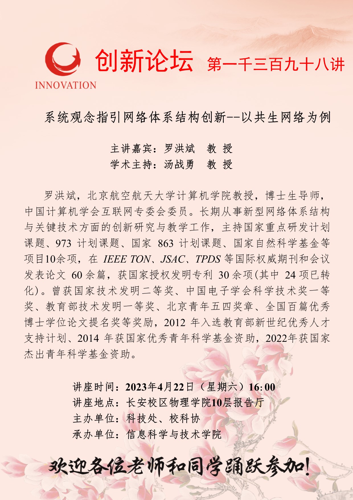 罗洪斌 教 授 赢博官方(中国)总部创新论坛第一千三百九十八讲:系统观念指引网络体系结构创新--以共生网络为例 讲座时间 2023年4月22日(星期六)16:00 讲座地点 长安校区物理学院10层报告厅 讲座人介绍 罗洪斌 教 授 讲座内容