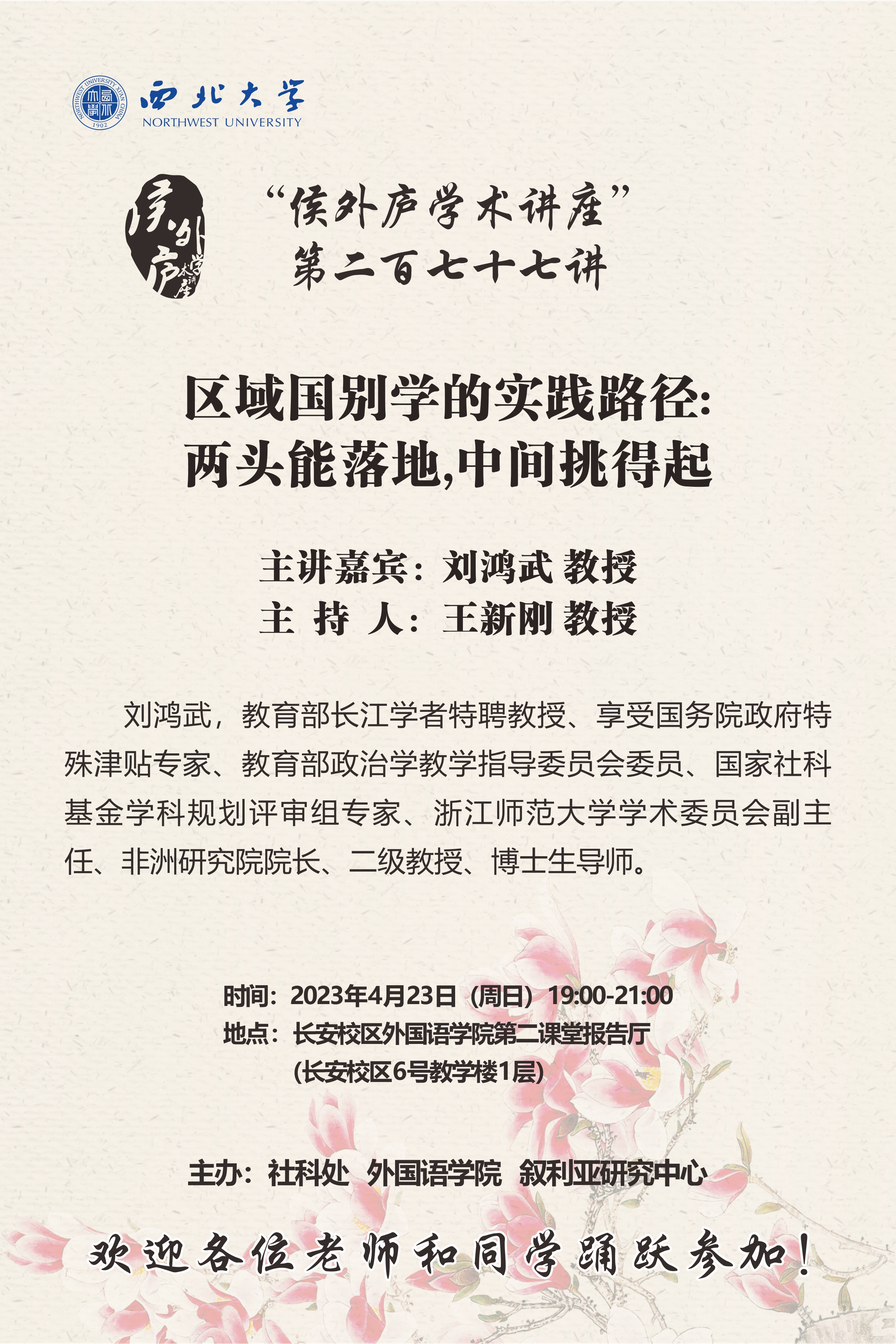 刘鸿武 教授 侯外庐学术讲座第二百七十七讲:区域国别学的实践路径:两头能落地,中间挑得起 讲座时间 2023年4月23日(周日)19:00 讲座地点 赢博官方(中国)总部外国语学院第二课堂报告厅 讲座人介绍 刘鸿武 教授 讲座内容
