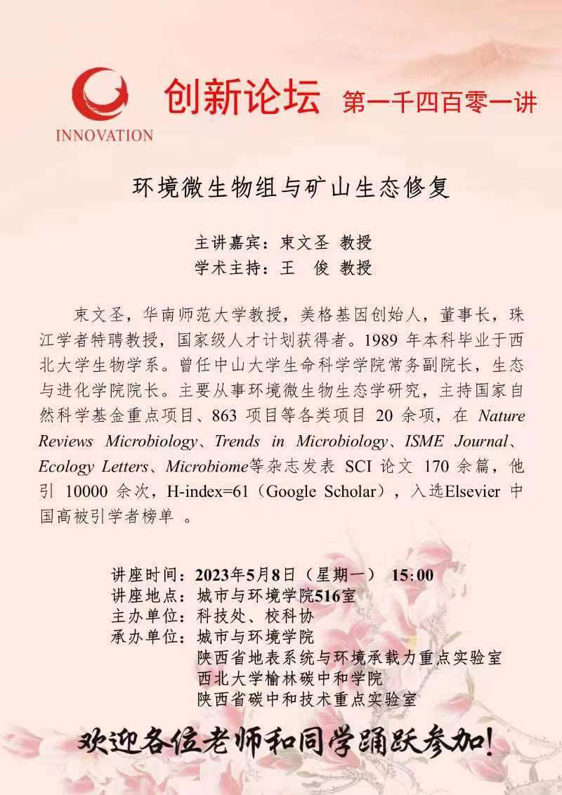 束文圣 教授 赢博官方(中国)总部创新论坛第一千四百零一讲:环境微生物组与矿山生态修复 讲座时间 2023年5月8日(星期一) 15:00 讲座地点 城市与环境学院516室 讲座人介绍 束文圣 教授 讲座内容