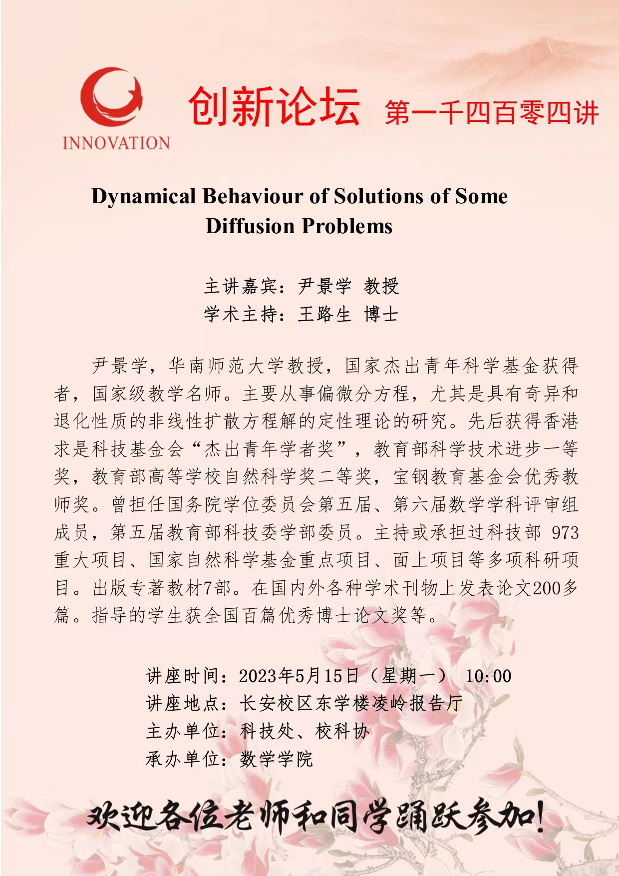 尹景学 教授 赢博官方(中国)总部创新论坛第一千四百零四讲:Dynamical Behaviour of Solutions of Some Diffusion Problems 讲座时间 2023年5月15日(星期一) 10:00 讲座地点 长安校区东学楼凌岭报告厅 讲座人介绍 尹景学 教授 讲座内容