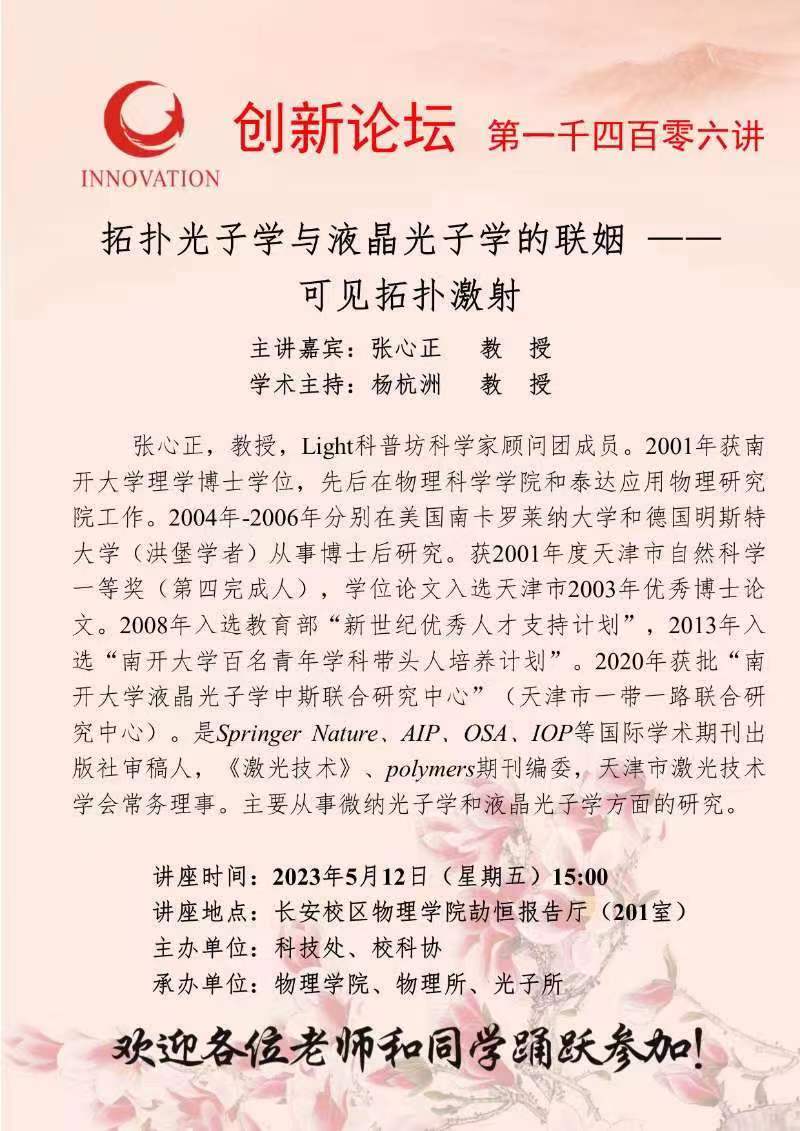 张心正 教 授 赢博官方(中国)总部创新论坛第一千四百零六讲:拓扑光子学与液晶光子学的联姻 — 可见拓扑激射 讲座时间 2023年5月12日(星期五)15:00 讲座地点 长安校区物理学院劼恒报告厅(201室) 讲座人介绍 张心正 教 授 讲座内容