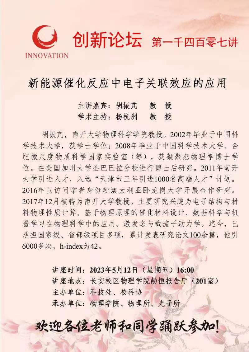 胡振芃 教 授 赢博官方(中国)总部创新论坛第一千四百零七讲:新能源催化反应中电子关联效应的应用 讲座时间 2023年5月12日(星期五)16:00 讲座地点 长安校区物理学院劼恒报告厅(201室) 讲座人介绍 胡振芃 教 授 讲座内容