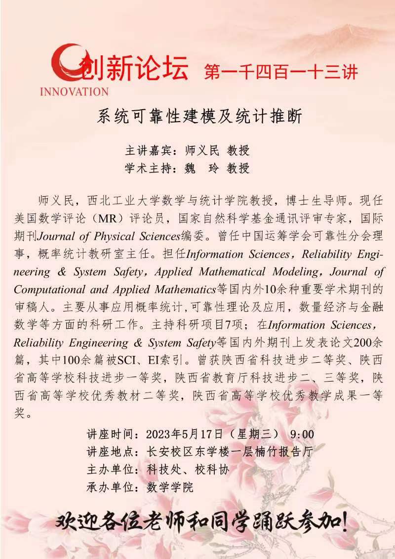 师义民 教授 赢博官方(中国)总部创新论坛第一千四百一十三讲:系统可靠性建模及统计推断 讲座时间 2023年5月17日(星期三) 9:00 讲座地点 长安校区东学楼一层楠竹报告厅 讲座人介绍 师义民 教授 讲座内容