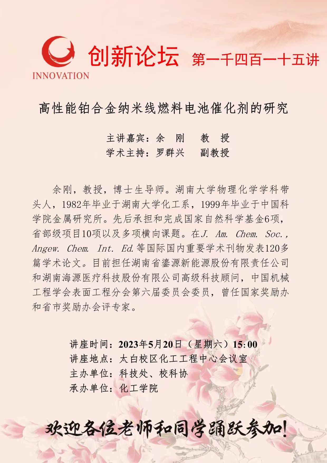 余 刚 教 授 赢博官方(中国)总部创新论坛第一千四百一十五讲:高性能铂合金纳米线燃料电池催化剂的研究 讲座时间 2023年5月20日(星期六)15:00 讲座地点 太白校区化工工程中心会议室 讲座人介绍 余 刚 教 授 讲座内容