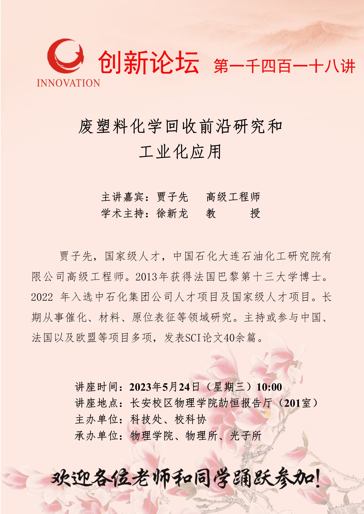 贾子先 高级工程师 赢博官方(中国)总部创新论坛第一千四百一十八讲:废塑料化学回收前沿研究和工业化应用 讲座时间 2023年5月24日(星期三)10:00 讲座地点 长安校区物理学院劼恒报告厅(201室) 讲座人介绍 贾子先 高级工程师 讲座内容