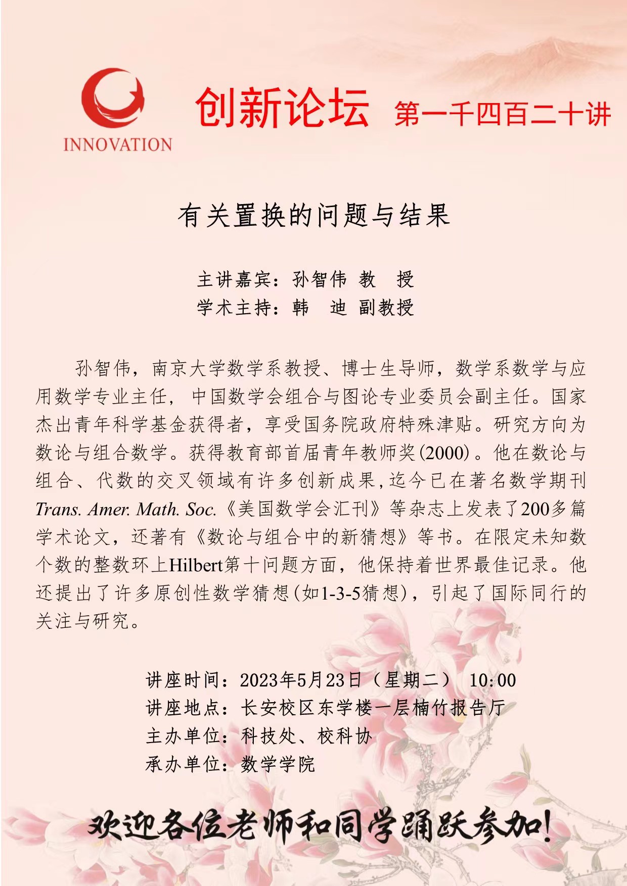 孙智伟 教 授 赢博官方(中国)总部创新论坛第一千四百二十讲:有关置换的问题与结果 讲座时间 2023年5月23日(星期二) 10:00 讲座地点 长安校区东学楼一层楠竹报告厅 讲座人介绍 孙智伟 教 授 讲座内容
