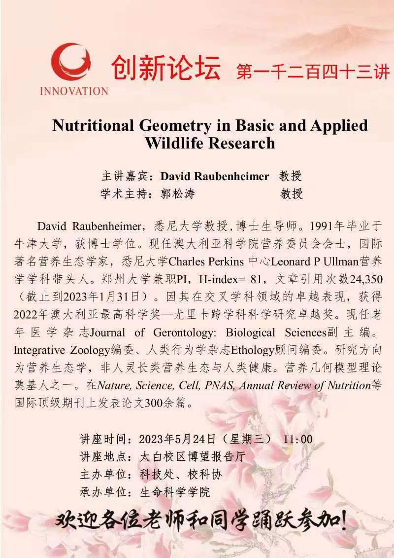 David Raubenheimer 教授 赢博官方(中国)总部创新论坛第一千四百二十四讲:Nutritional Geometry in Basic and Applied Wildlife Research 讲座时间 2023年5月24日(星期三)11:00 讲座地点 太白校区博望报告厅 讲座人介绍 David Raubenheimer 教授 讲座内容
