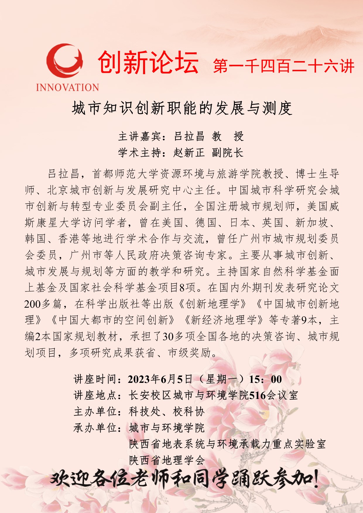 吕拉昌 教授 赢博官方(中国)总部创新论坛第一千四百二十六讲:城市知识创新职能的发展与测度 讲座时间 2023年6月5日(星期一)15:00 讲座地点 长安校区城市与环境学院516会议室 讲座人介绍 吕拉昌 教授 讲座内容