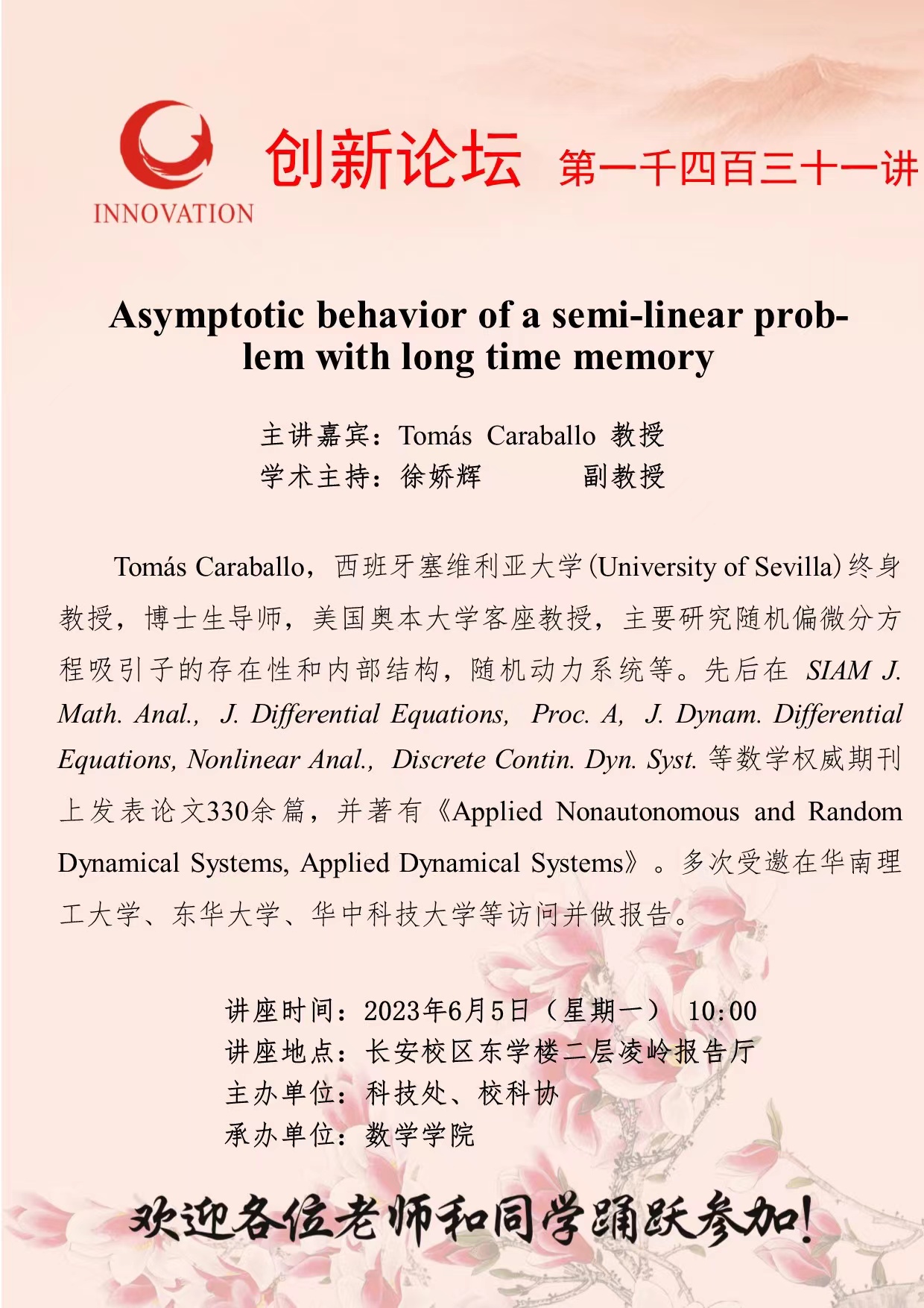 Tomás Caraballo 教授 赢博官方(中国)总部创新论坛第一千四百三十一讲:Asymptotic behavior of a semi-linear problem with long time memory 讲座时间 2023年6月5日(星期一) 10:00 讲座地点 长安校区东学楼二层凌岭报告厅 讲座人介绍 Tomás Caraballo 教授 讲座内容