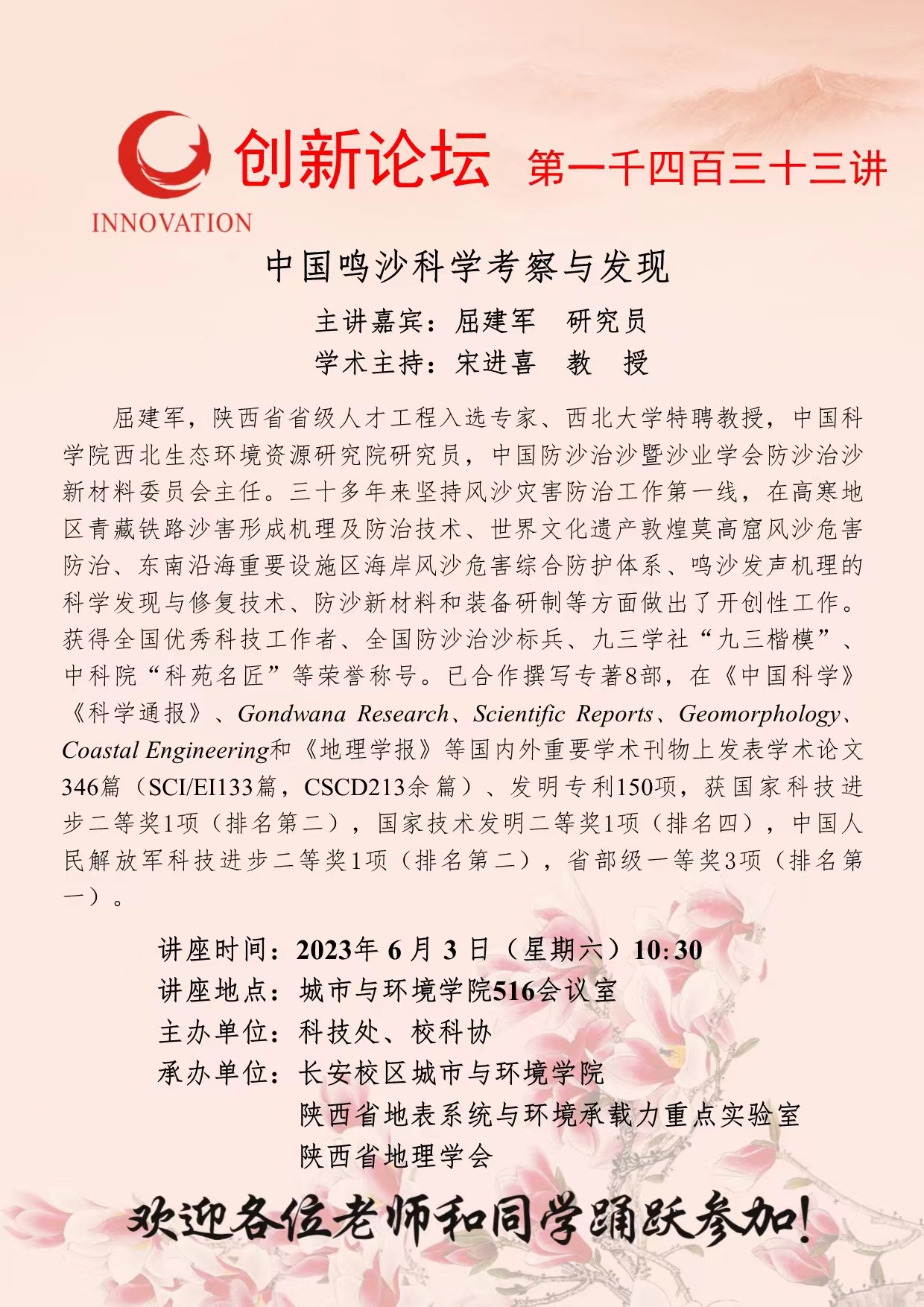 屈建军 研究员 赢博官方(中国)总部创新论坛第一千四百三十三讲:中国鸣沙科学考察与发现 讲座时间 2023年6月3日(星期六)10:30 讲座地点 城市与环境学院516会议室 讲座人介绍 屈建军 研究员 讲座内容