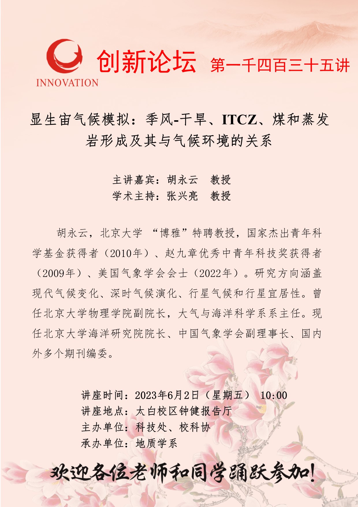 胡永云 教授 赢博官方(中国)总部创新论坛第一千四百三十五讲:显生宙气候模拟:季风-干旱、ITCZ、煤和蒸发岩形成及其与气候环境的关系 讲座时间 2023年6月2日(星期五) 10:00 讲座地点 太白校区钟健报告厅 讲座人介绍 胡永云 教授 讲座内容