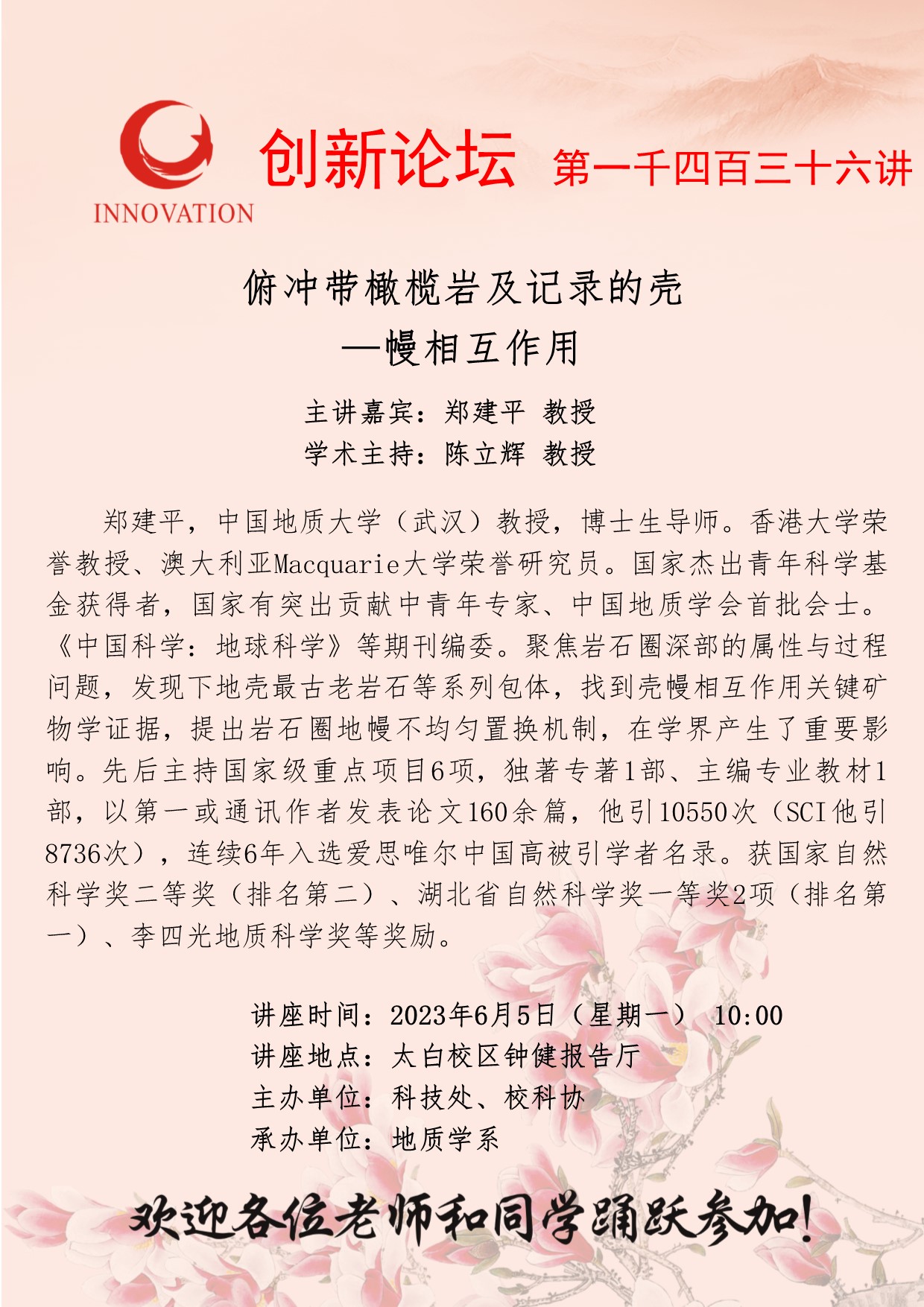 郑建平 教授 赢博官方(中国)总部创新论坛第一千四百三十六讲:俯冲带橄榄岩及记录的壳—幔相互作用 讲座时间 2023年6月5日(星期一) 10:00 讲座地点 太白校区钟健报告厅 讲座人介绍 郑建平 教授 讲座内容
