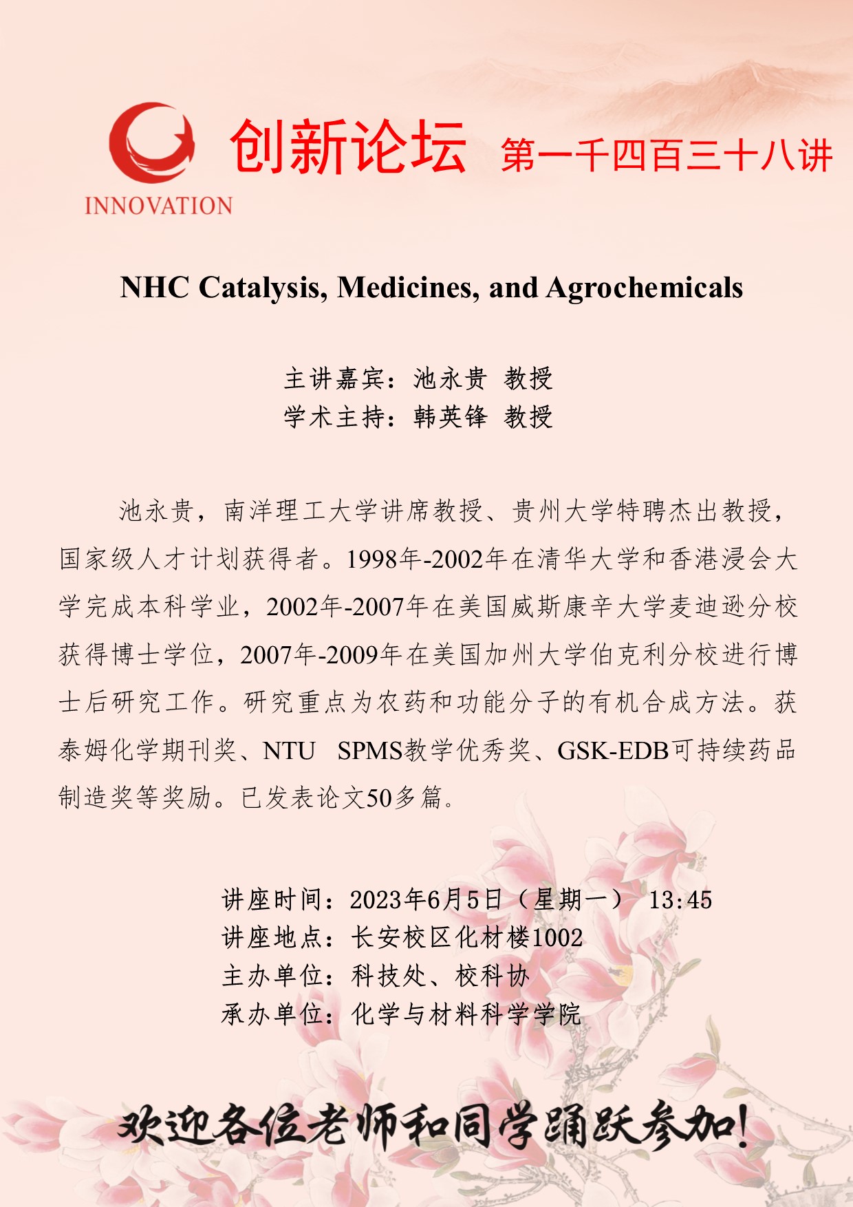 池永贵 教授 赢博官方(中国)总部创新论坛第一千四百三十八讲:NHC Catalysis, Medicines, and Agrochemicals 讲座时间 2023年6月5日(星期一) 13:45 讲座地点 长安校区化材楼1002 讲座人介绍 池永贵 教授 讲座内容