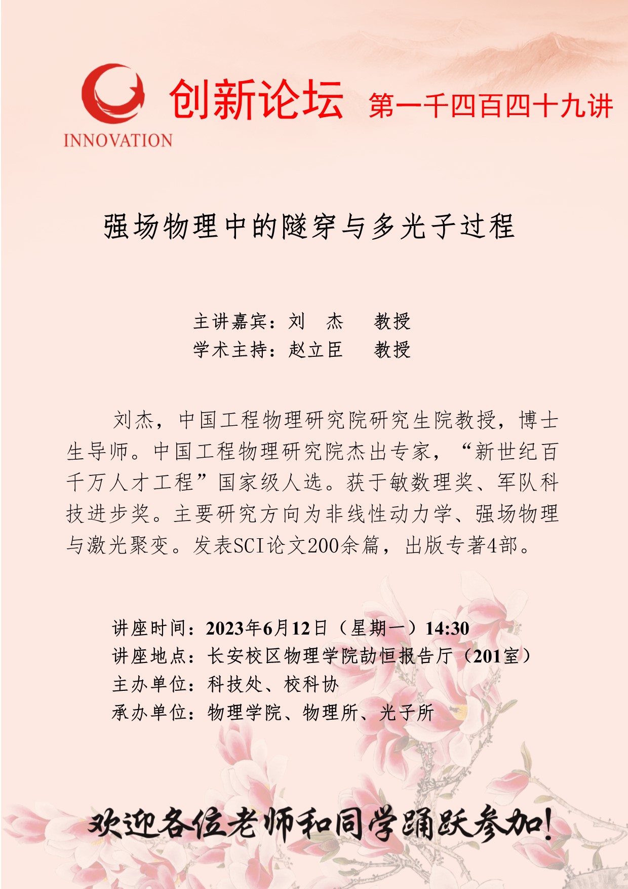 刘 杰 教授 赢博官方(中国)总部创新论坛第一千四百四十九讲:强场物理中的隧穿与多光子过程 讲座时间 2023年6月12日(星期一)14:30 讲座地点 长安校区物理学院劼恒报告厅(201室) 讲座人介绍 刘 杰 教授 讲座内容