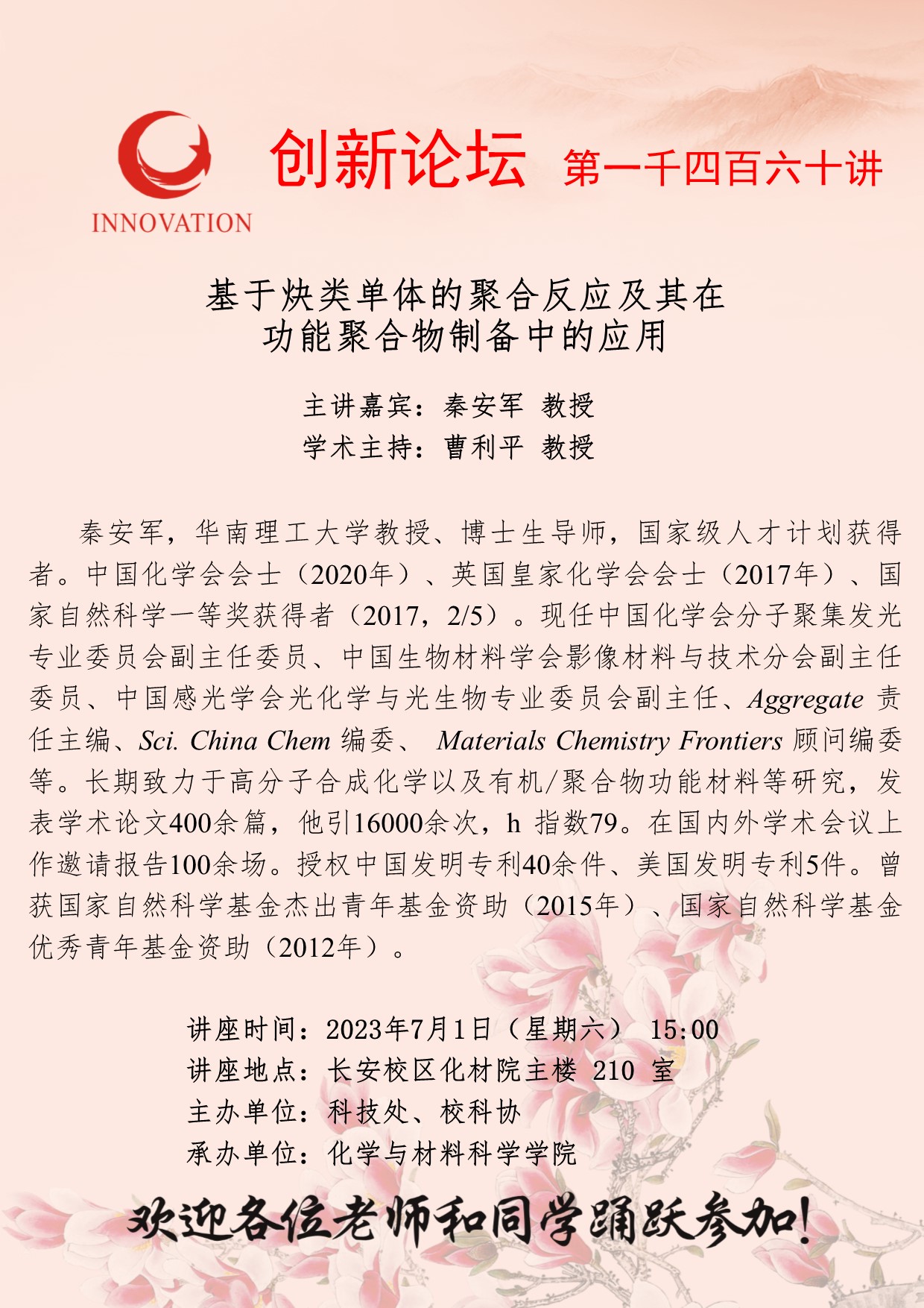秦安军 教授 赢博官方(中国)总部创新论坛第一千四百六十讲:基于炔类单体的聚合反应及其在功能聚合物制备中的应用 讲座时间 2023年7月1日(星期六) 15:00 讲座地点 长安校区化材院主楼 210 室 讲座人介绍 秦安军 教授 讲座内容