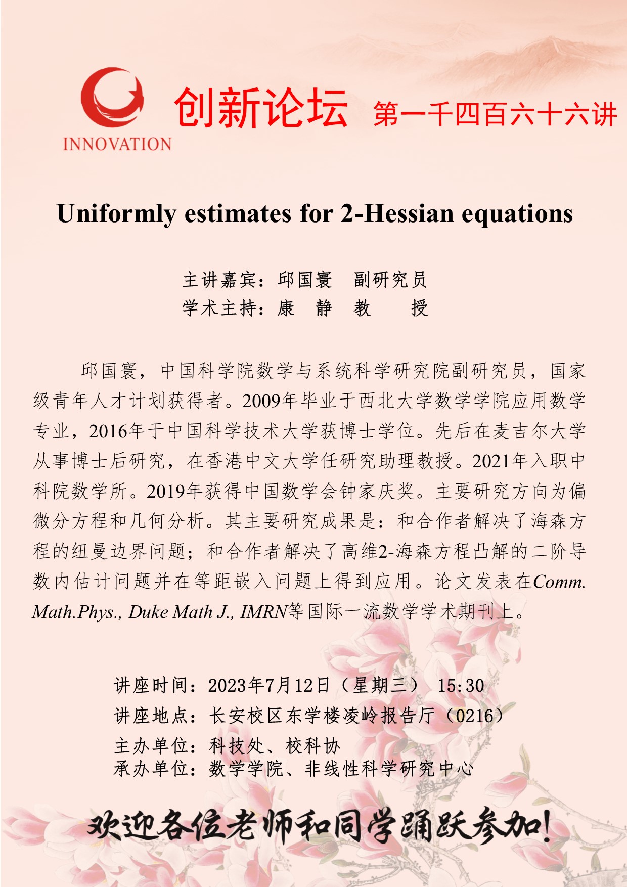 邱国寰 副研究员 赢博官方(中国)总部创新论坛第一千四百六十六讲:Uniformly estimates for 2-Hessian equations 讲座时间 2023年7月12日(星期三) 15:30 讲座地点 长安校区东学楼凌岭报告厅(0216) 讲座人介绍 邱国寰 副研究员 讲座内容