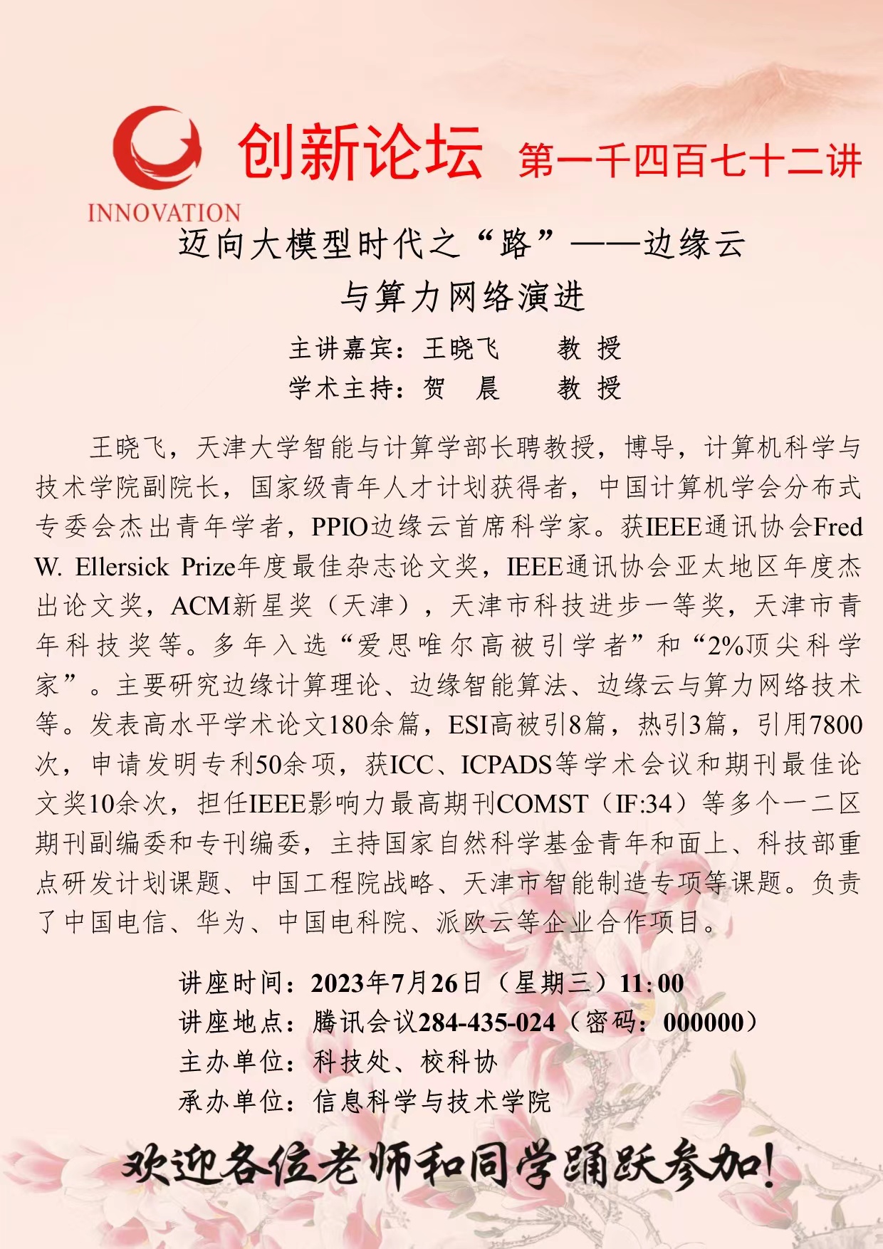 王晓飞 教授 赢博官方(中国)总部创新论坛第一千四百七十二讲:迈向大模型时代之“路”—边缘云与算力网络演进 讲座时间 2023年7月26日(星期三)11:00 讲座地点 腾讯会议284-435-024(密码:000000) 讲座人介绍 王晓飞 教授 讲座内容