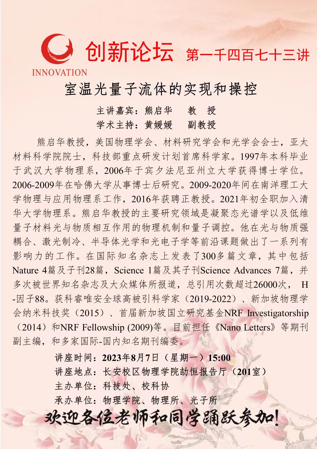 熊启华 教授 赢博官方(中国)总部创新论坛第一千四百七十三讲:温室光量子流体的实现和操控 讲座时间 2023年8月7日(星期一)15:00 讲座地点 长安校区物理学院劼恒报告厅 讲座人介绍 熊启华 教授 讲座内容