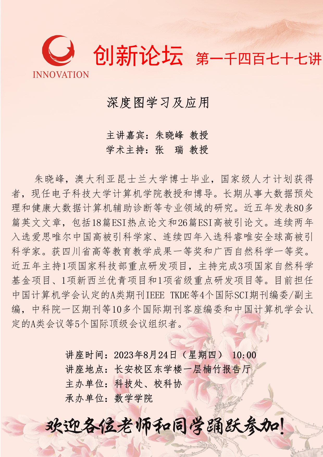 朱晓峰 教授 赢博官方(中国)总部创新论坛第一千四百七十七讲:深度图学习及应用 讲座时间 2023年8月24日(星期四) 10:00 讲座地点 长安校区东学楼一层楠竹报告厅 讲座人介绍 朱晓峰 教授 讲座内容