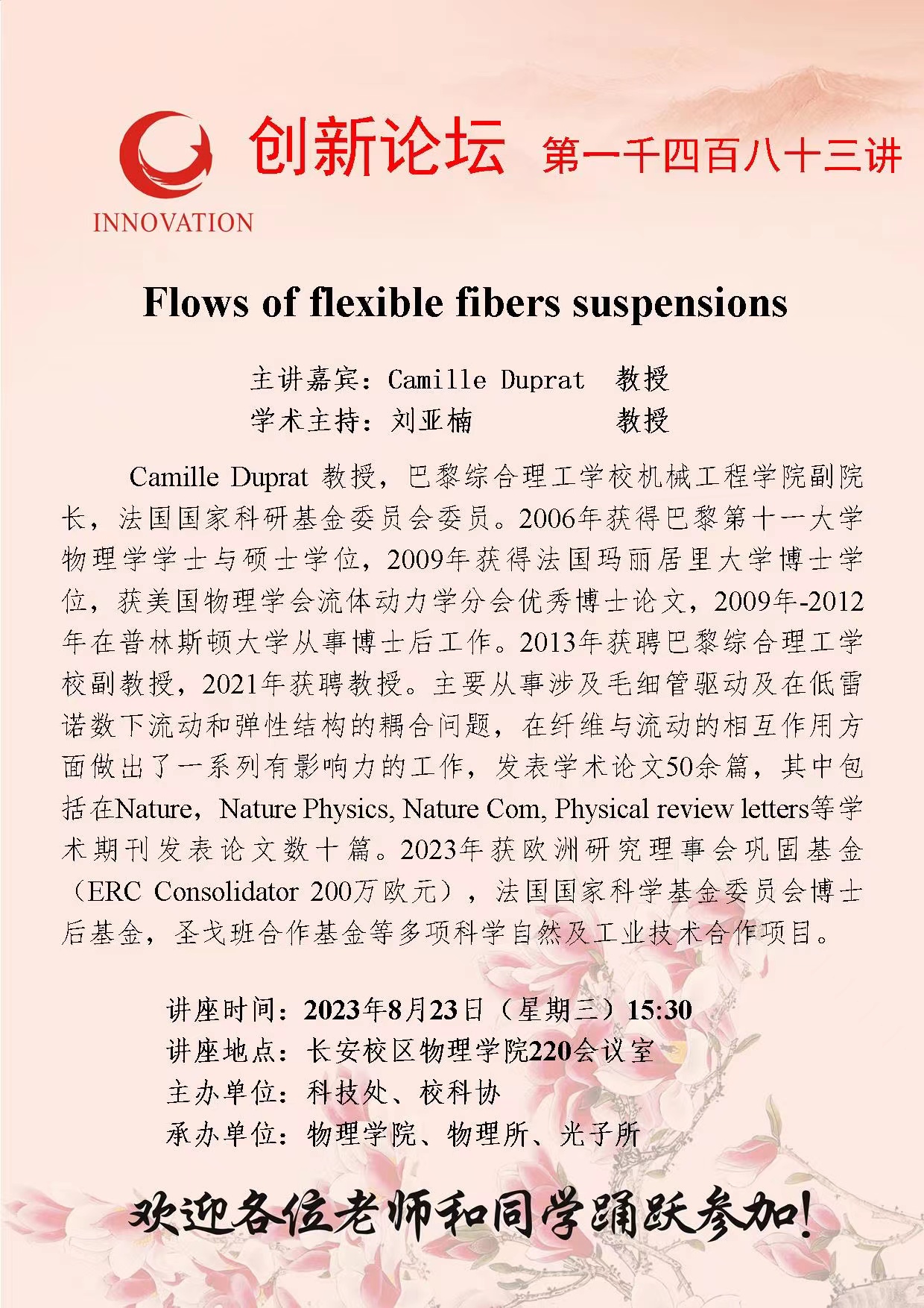 Camille Duprat 教授 赢博官方(中国)总部创新论坛第一千四百八十三讲:Flows of flexible fibers suspensions 讲座时间 2023年8月23日(星期三) 15:30 讲座地点 长安校区物理学院220会议室 讲座人介绍 Camille Duprat 教授 讲座内容