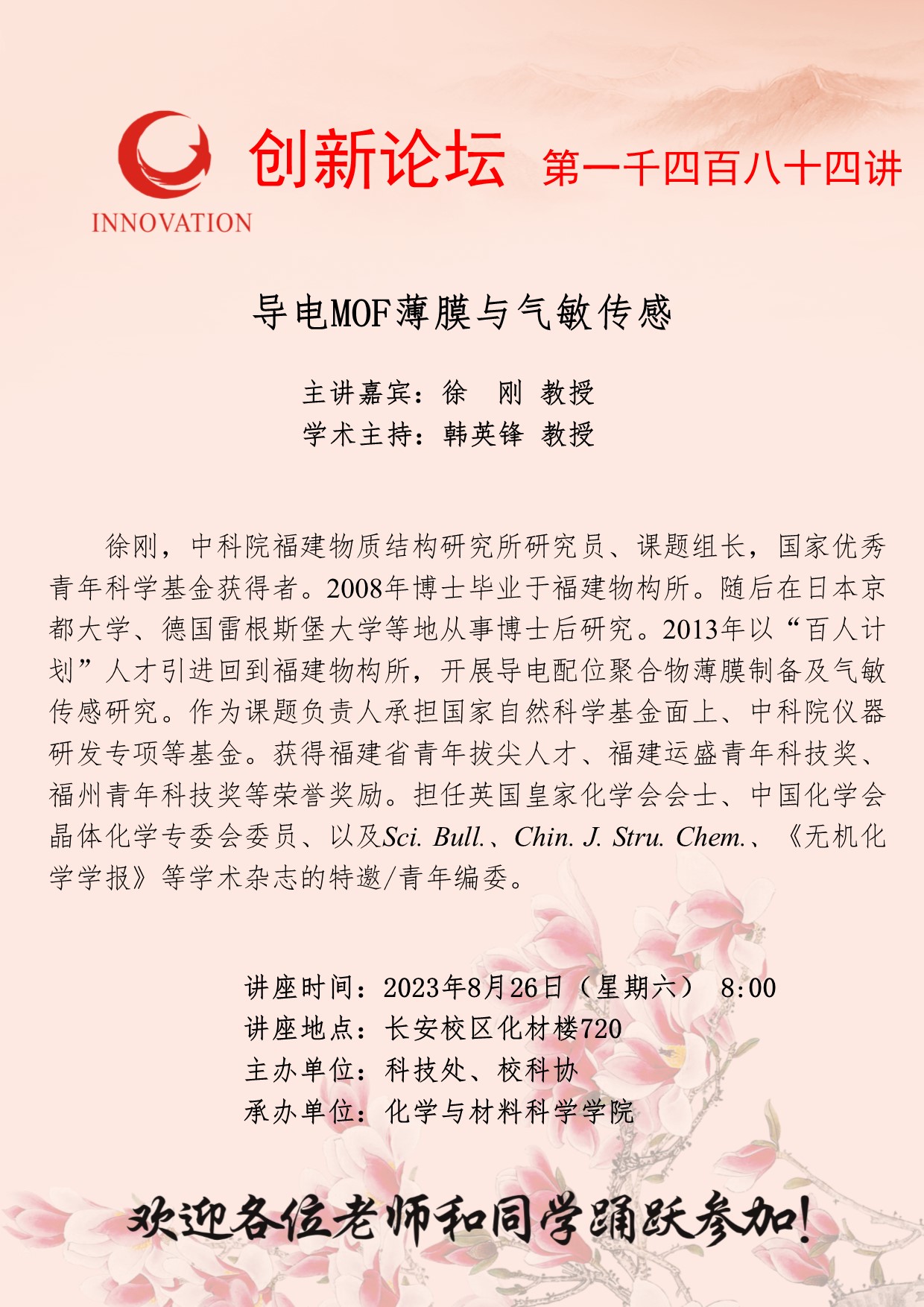 徐刚 教授 赢博官方(中国)总部创新论坛第一千四百八十四讲:导电MOF薄膜与气敏传感 讲座时间 2023年8月26日(星期六) 8:00 讲座地点 长安校区化材楼720 讲座人介绍 徐刚 教授 讲座内容