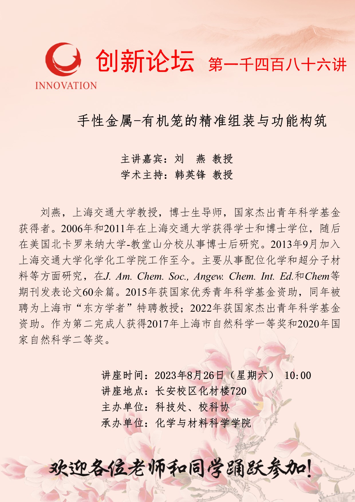 刘燕 教授 赢博官方(中国)总部创新论坛第一千四百八十六讲:手性金属-有机笼的精准组装与功能构筑 讲座时间 2023年8月26日(星期六) 10:00 讲座地点 长安校区化材楼720 讲座人介绍 刘燕 教授 讲座内容
