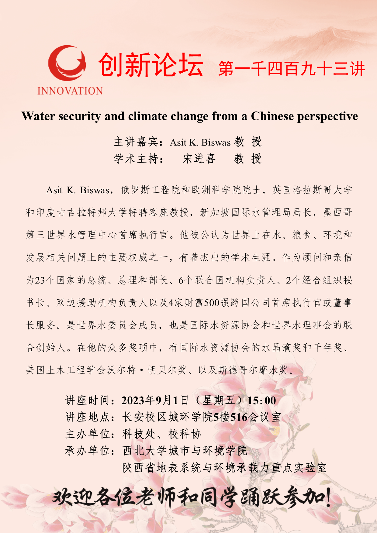 Asit K. Biswas 教授 赢博官方(中国)总部创新论坛第一千四百九十三讲:Water security and climate change from a Chinese perspective 讲座时间 2023年9月1日(星期五)15:00 讲座地点 长安校区城环学院5楼516会议室 讲座人介绍 Asit K. Biswas 教授 讲座内容