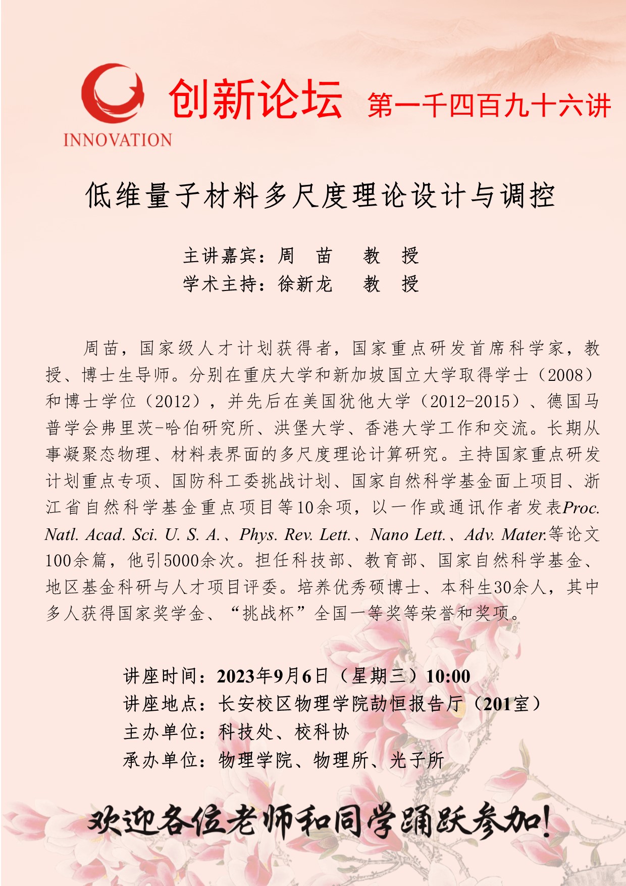 周苗 教授 赢博官方(中国)总部创新论坛第一千四百九十六讲:低维量子材料多尺度理论设计与调控 讲座时间 2023年9月6日(星期三)10:00 讲座地点 长安校区物理学院劼恒报告厅(201室) 讲座人介绍 周苗 教授 讲座内容