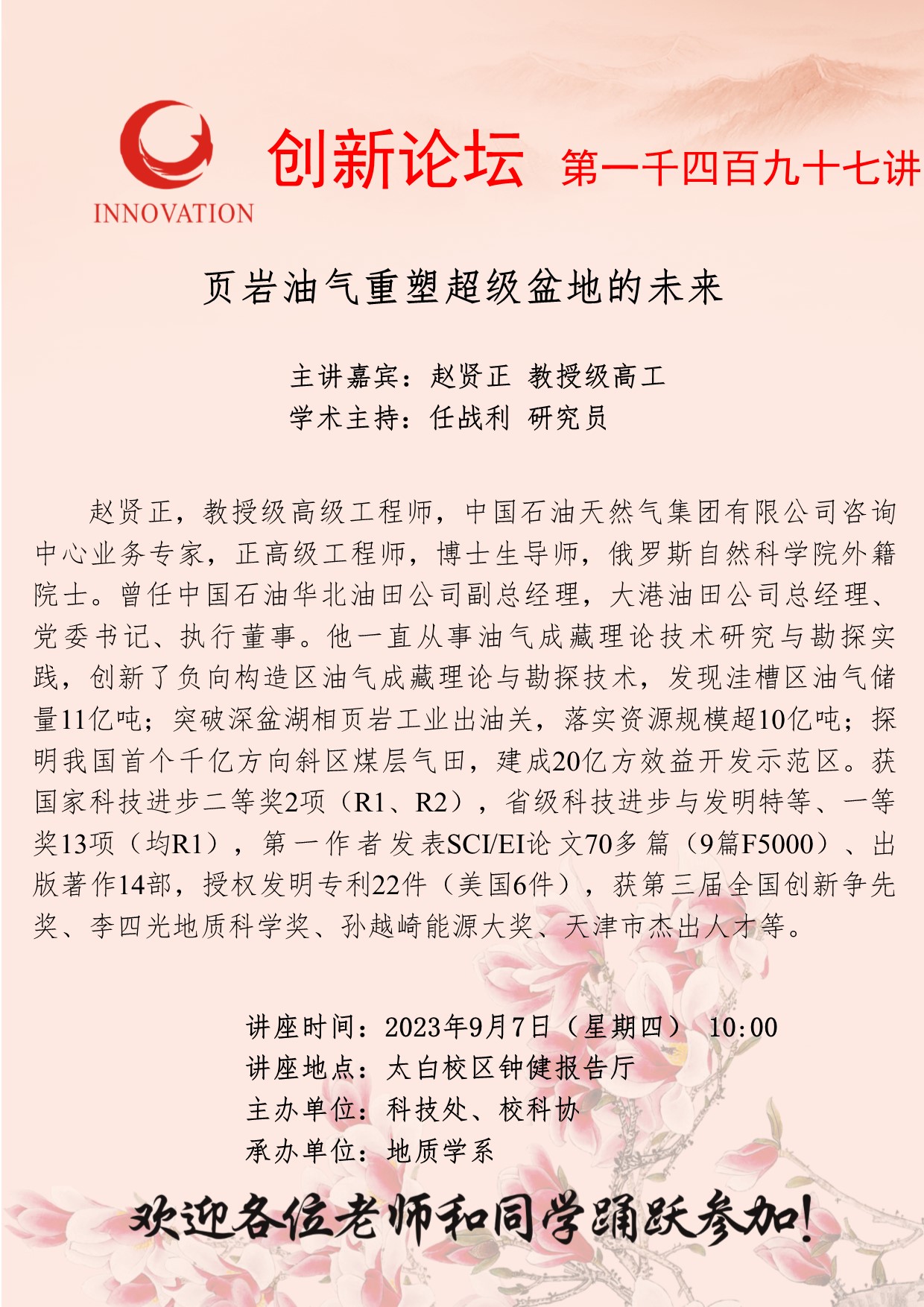 赵贤正 教授级高工 赢博官方(中国)总部创新论坛第一千四百九十七讲:页岩油气重塑超级盆地的未来 讲座时间 2023年9月7日(星期四) 10:00 讲座地点 太白校区钟健报告厅 讲座人介绍 赵贤正 教授级高工 讲座内容