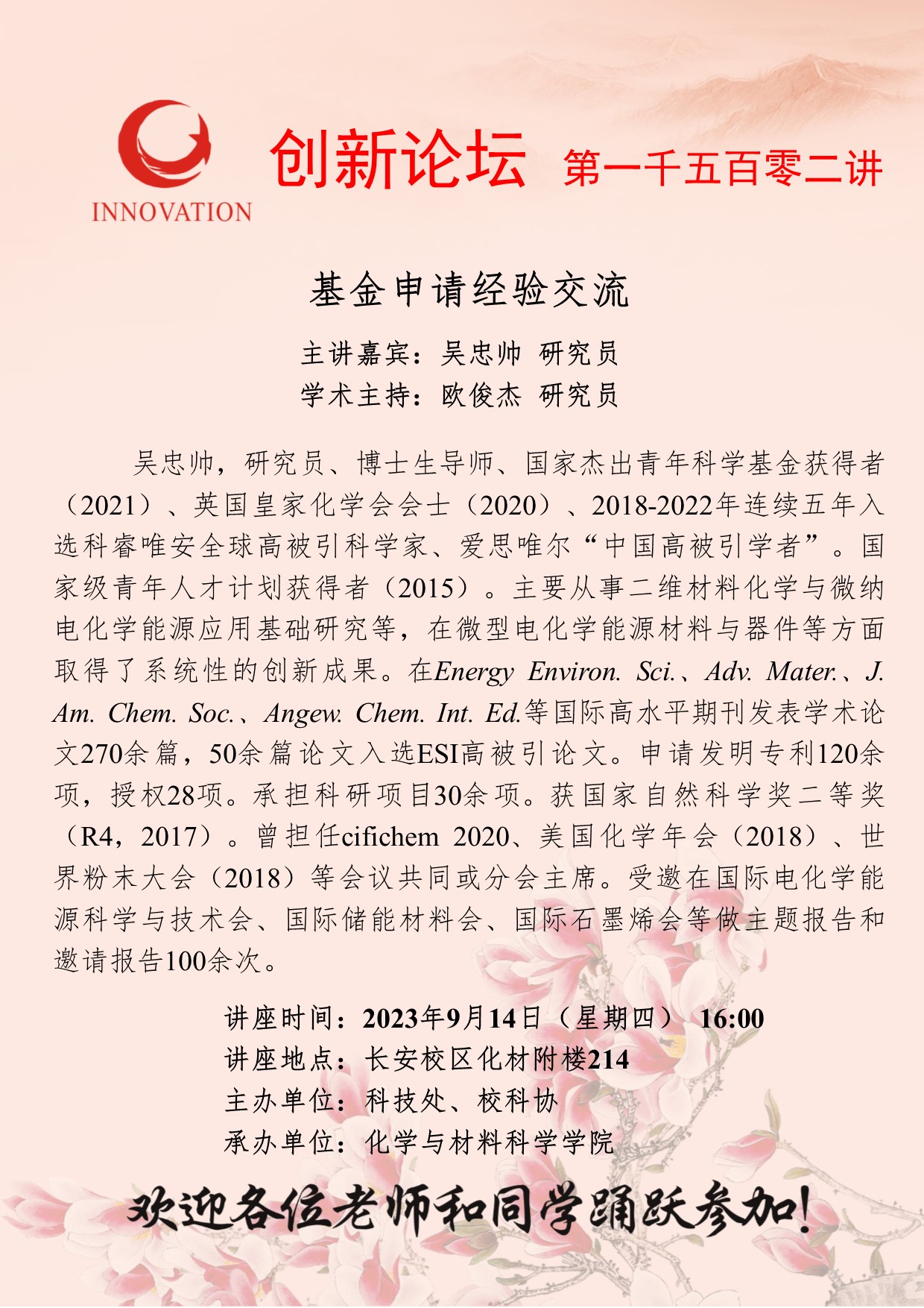 吴忠帅 研究员 赢博官方(中国)总部创新论坛第一千五百零二讲: 基金申请经验交流 讲座时间 2023年9月14日(星期四) 16:00 讲座地点 长安校区化材附楼214 讲座人介绍 吴忠帅 研究员 讲座内容