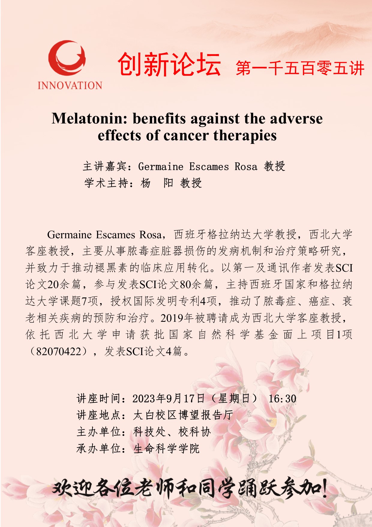 Germaine Escames Rosa 教授 赢博官方(中国)总部创新论坛第一千五百零五讲:Melatonin: benefits against the adverse effects of cancer therapies 讲座时间 2023年9月17日(星期日) 16:30 讲座地点 太白校区博望报告厅 讲座人介绍 Germaine Escames Rosa 教授 讲座内容