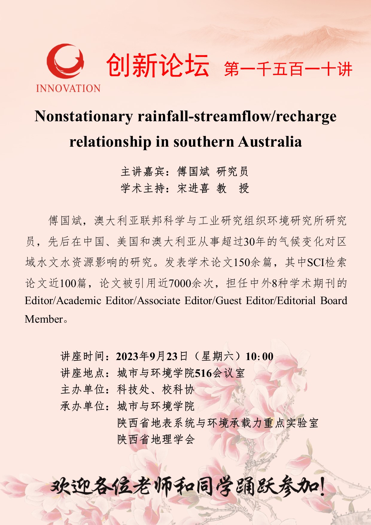 傅国斌 研究员 赢博官方(中国)总部创新论坛第一千五百一十讲:Nonstationary rainfall‐streamflow/recharge relationship in southern Australia 讲座时间 2023年9月23日(星期六)10:00 讲座地点 城市与环境学院516会议室 讲座人介绍 傅国斌 研究员 讲座内容
